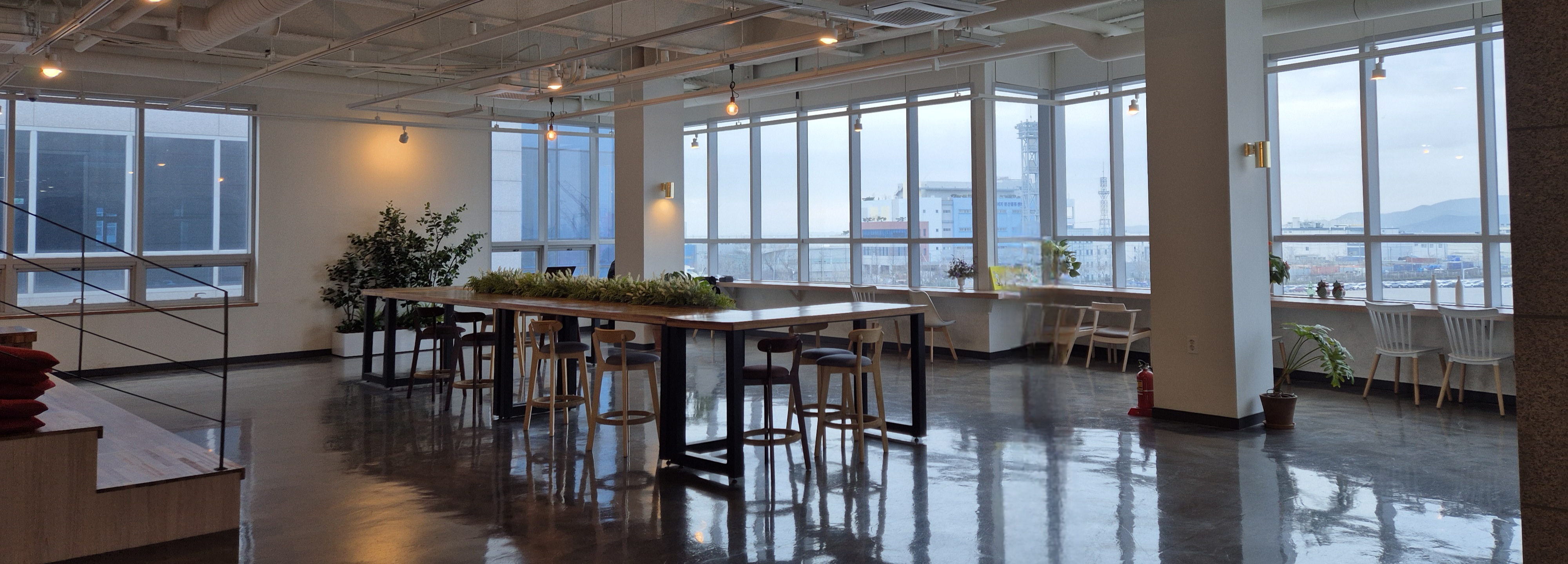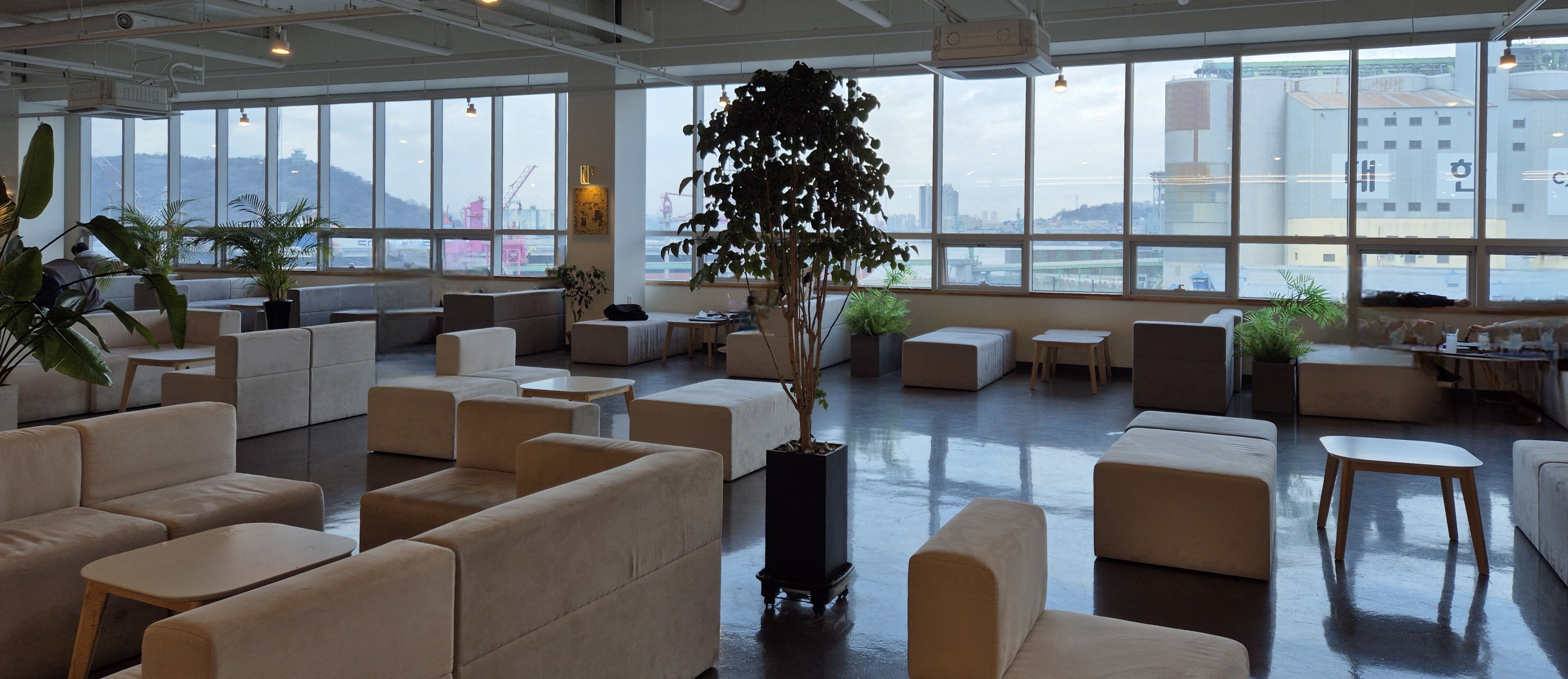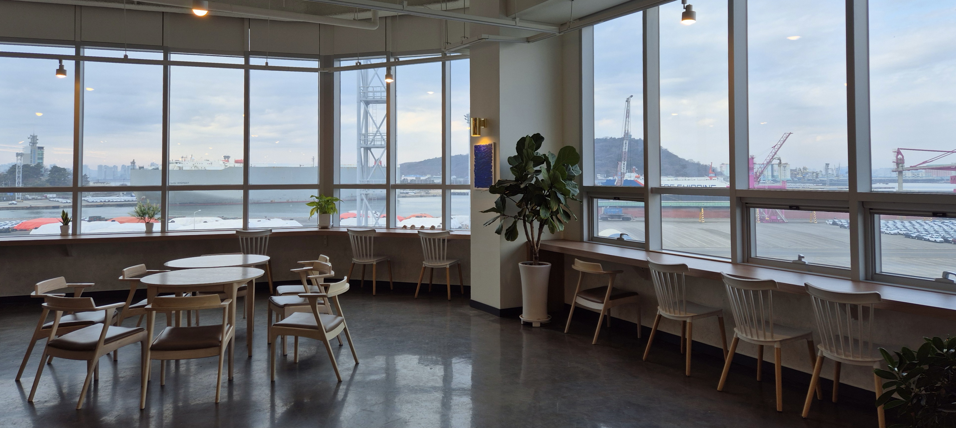 통창으로 되어있는 창가 자리는 개방감이 좋다. 가까이 다가가서 보면 인천항이 보인다. 일반적인 바다가 아니라 선적을 위해 대기 중인 차량들이 보인다.