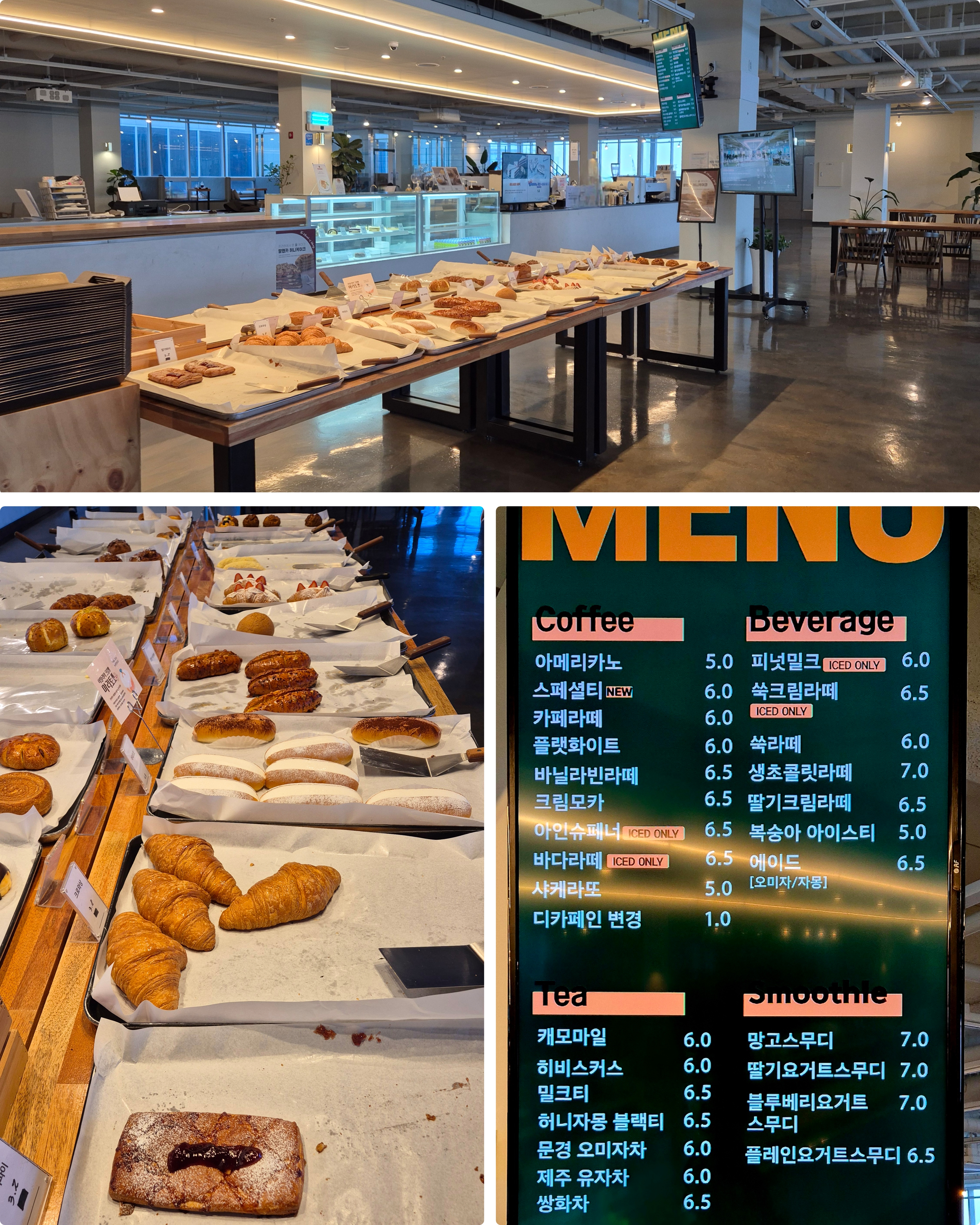카페 가운데 카운터가 있고 그 앞에 빵 진열대가 있다. 음료의 가격은 프랜차이즈 카페 수준이다.