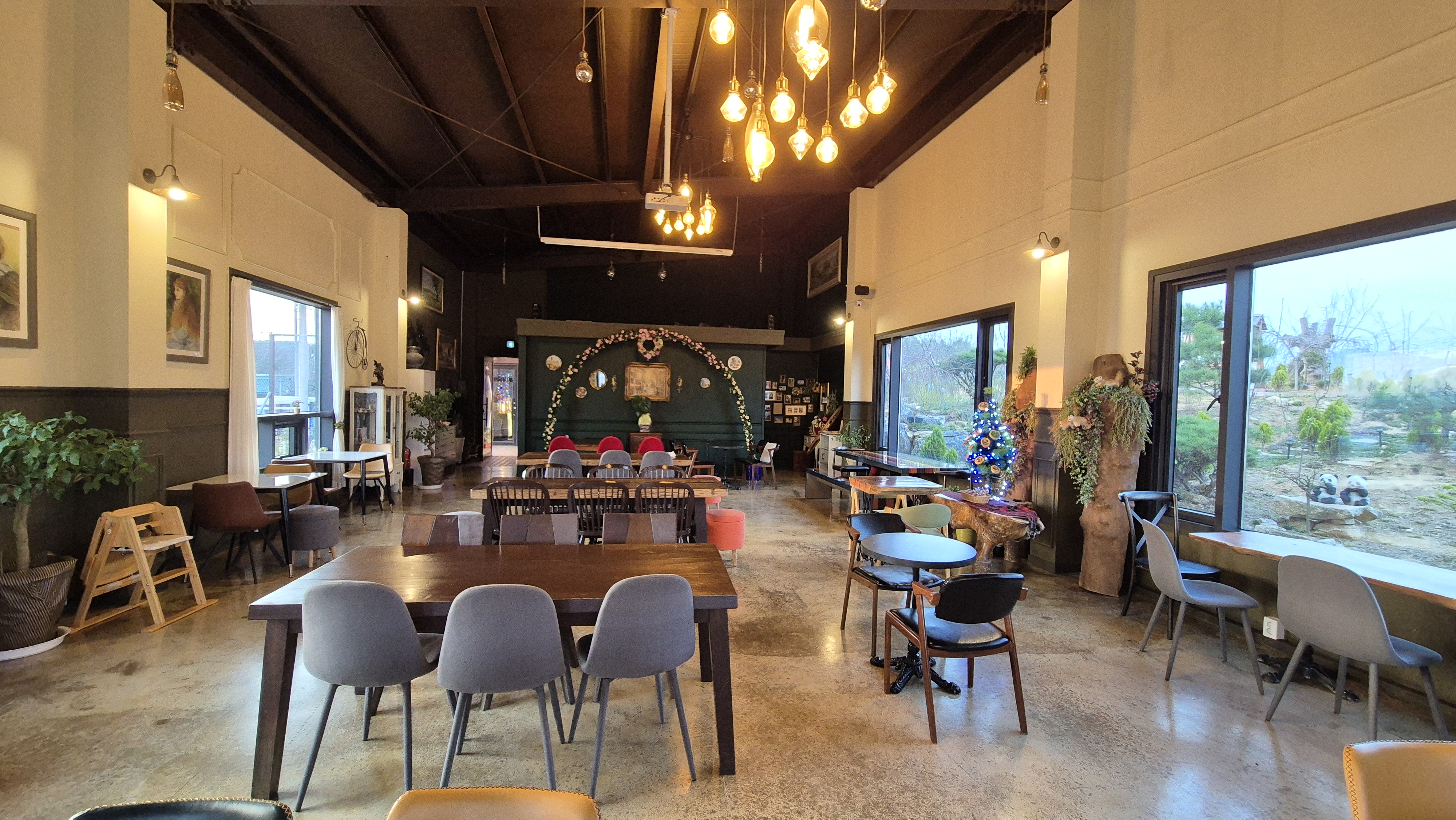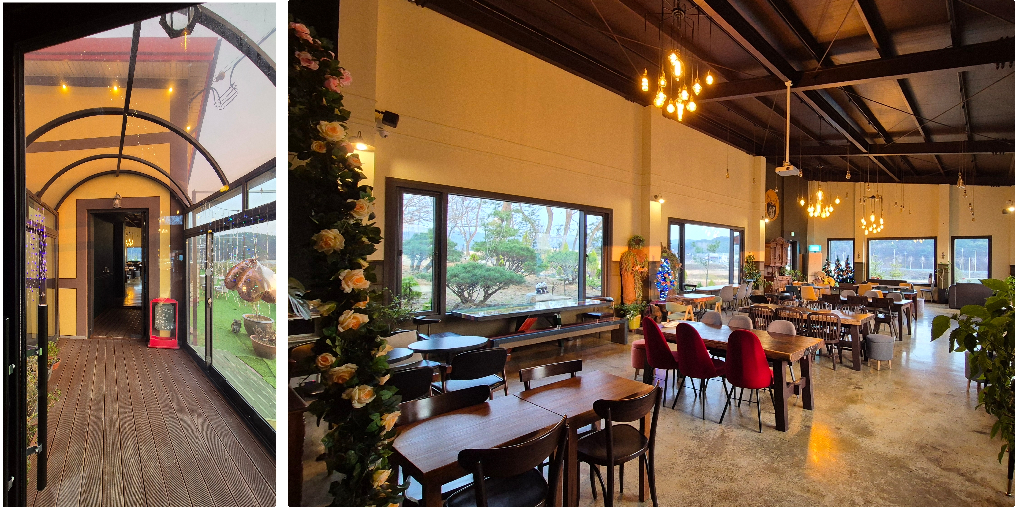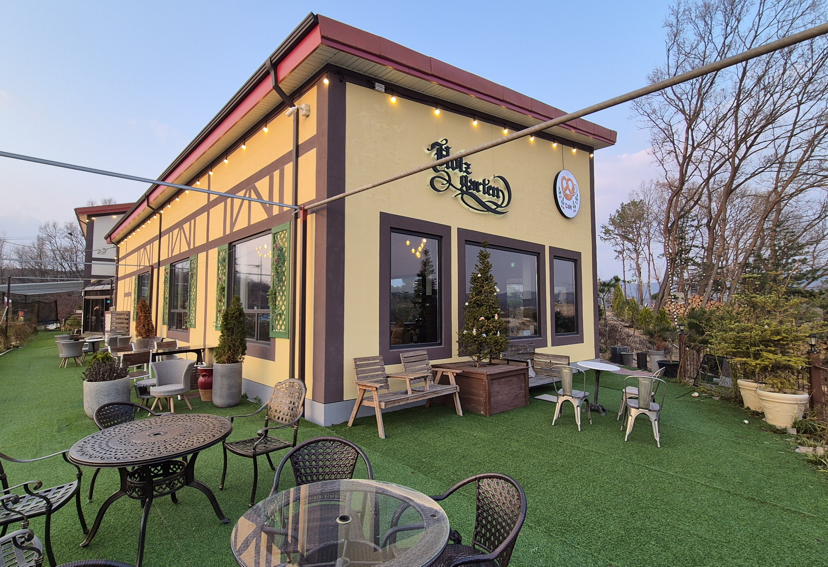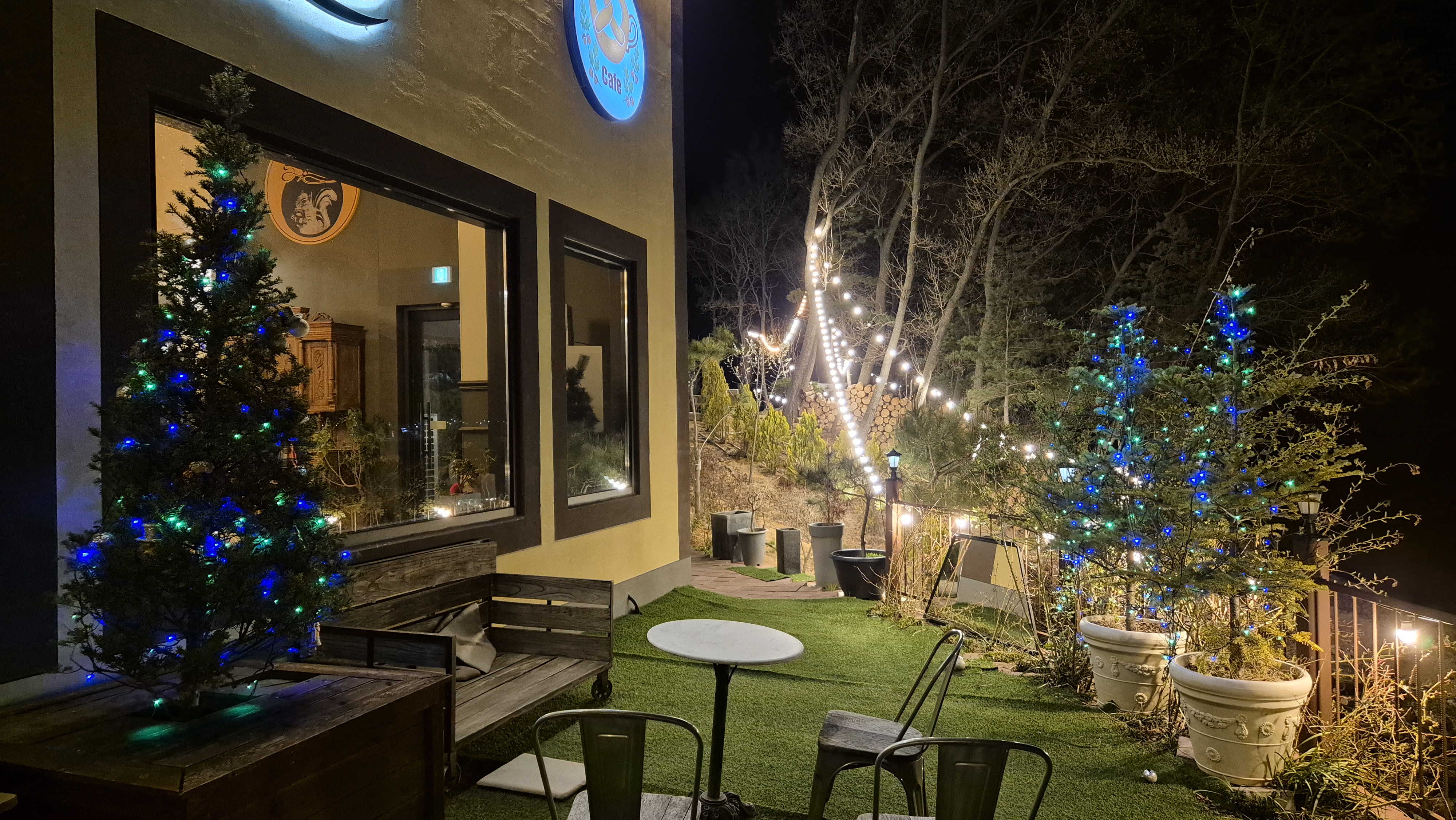 카페 주변에는 정원이 만들어지고 있는 듯하며 카페 뒤쪽에는 인조 잔디 위에 야외 테이블도 있다.