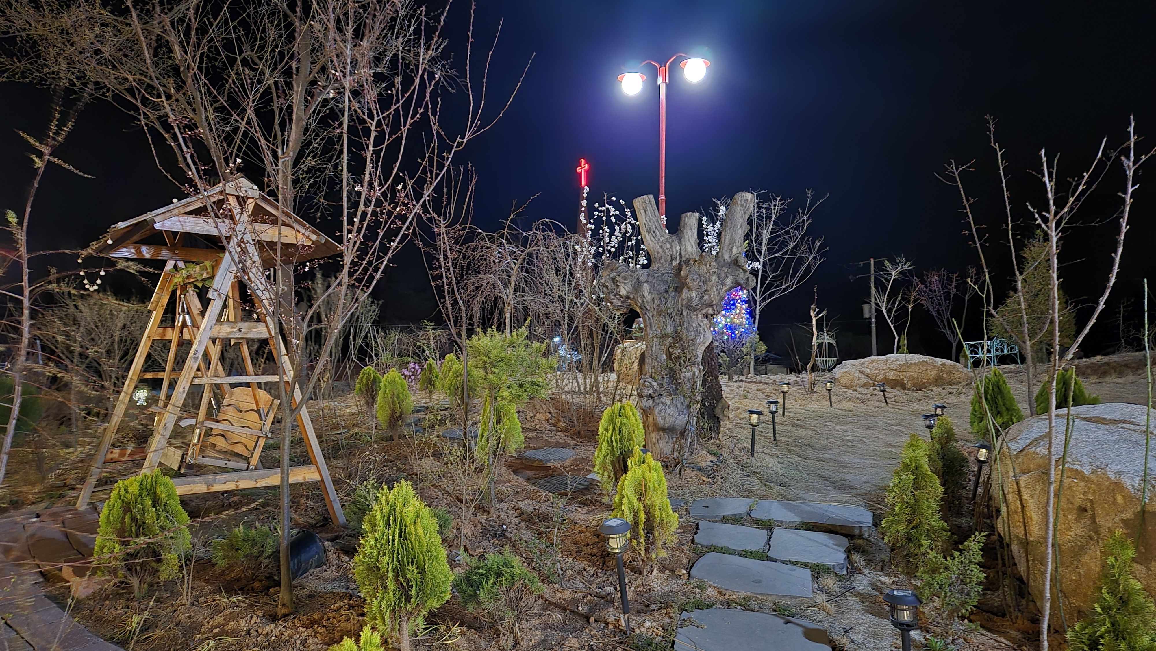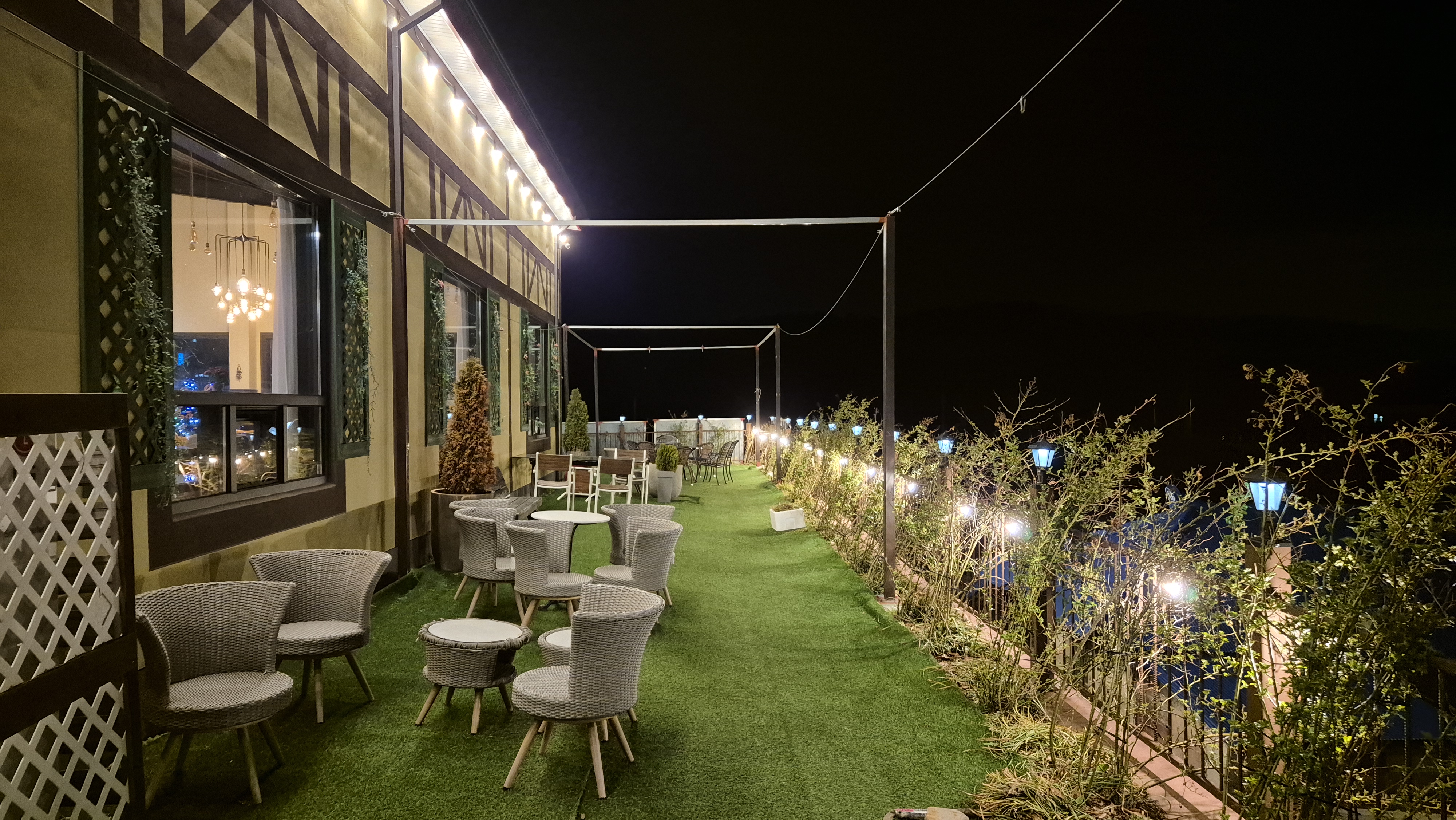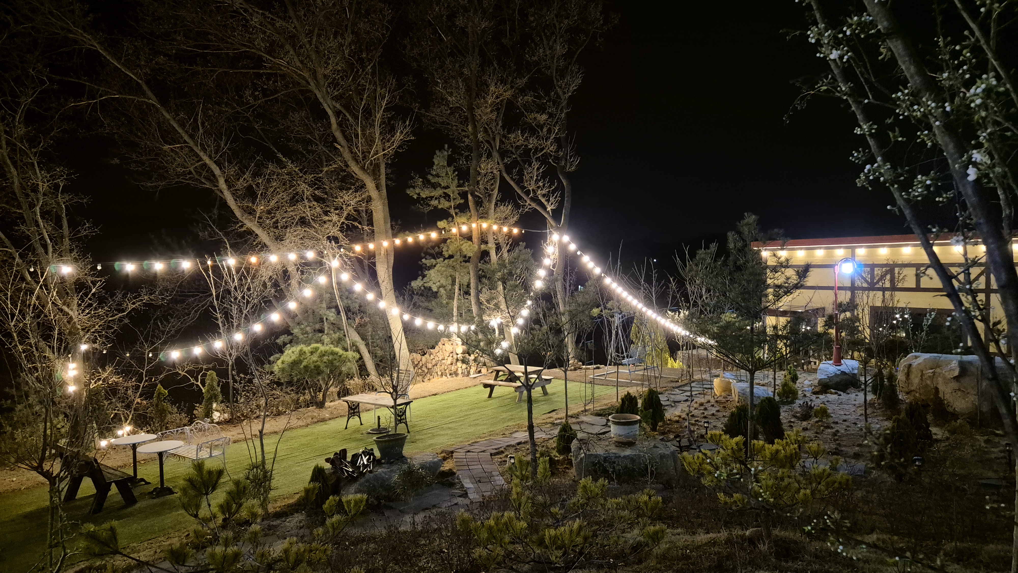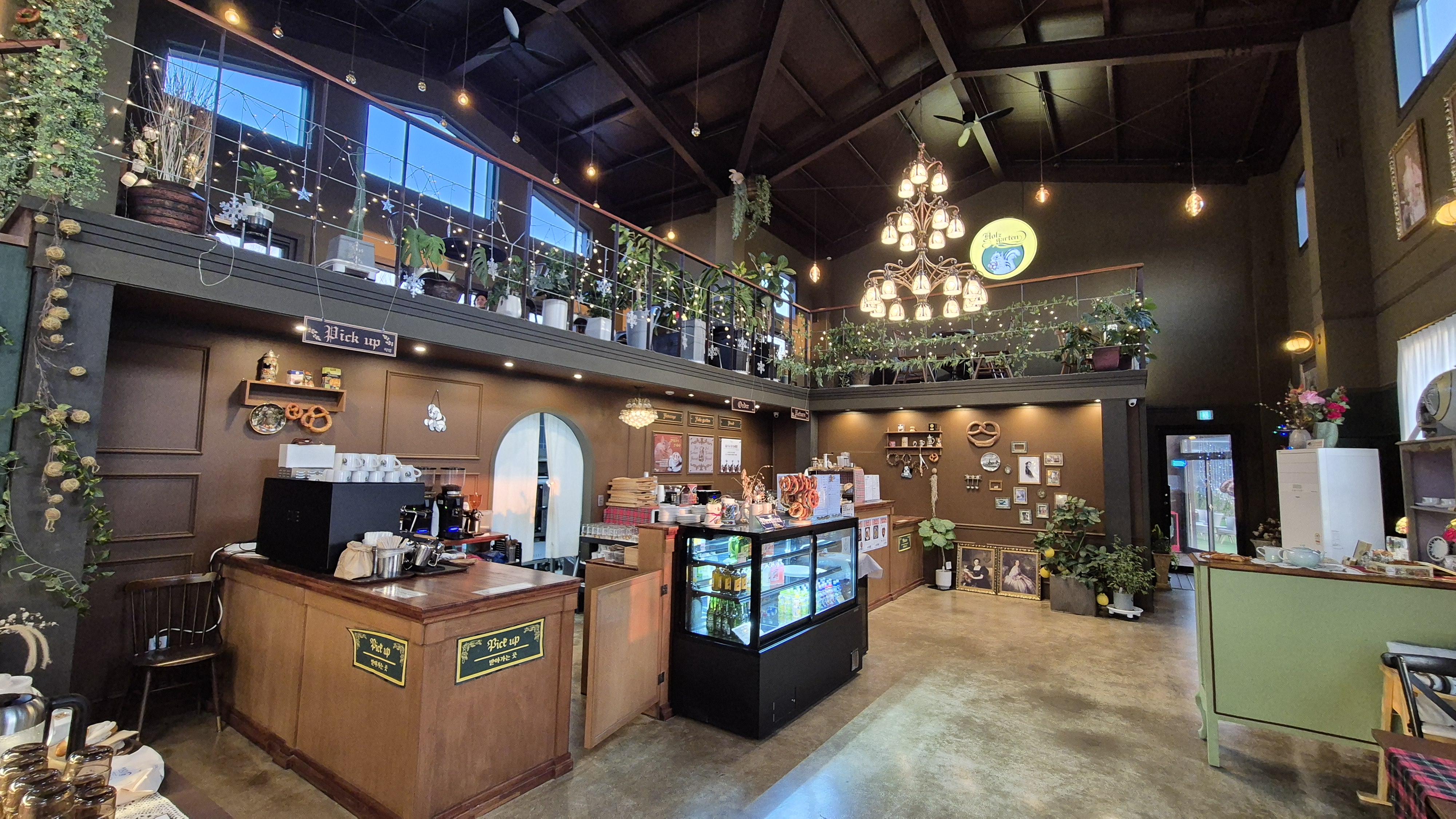 카페 주변에는 정원이 만들어지고 있는 듯하며 카페 뒤쪽에는 인조 잔디 위에 야외 테이블도 있다.