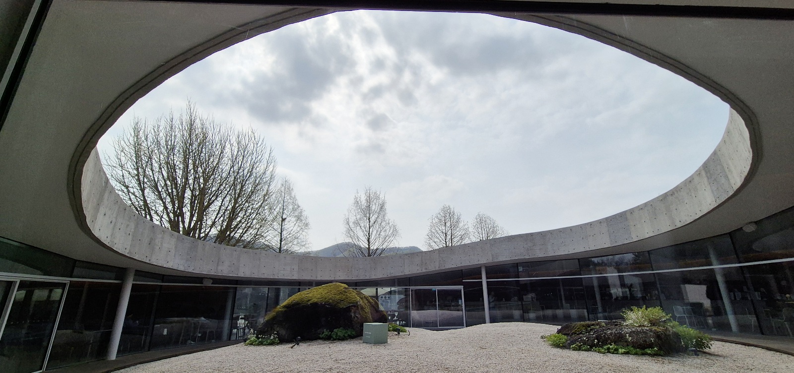 카페 건물은 가운데가 뚫려있는 원형의 독특한 구조이다. 하늘이 열린 공간에 큰 바위가 있어서 바위가 잘 보이는 자리에 '돌멍'석이라고 붙어있다.