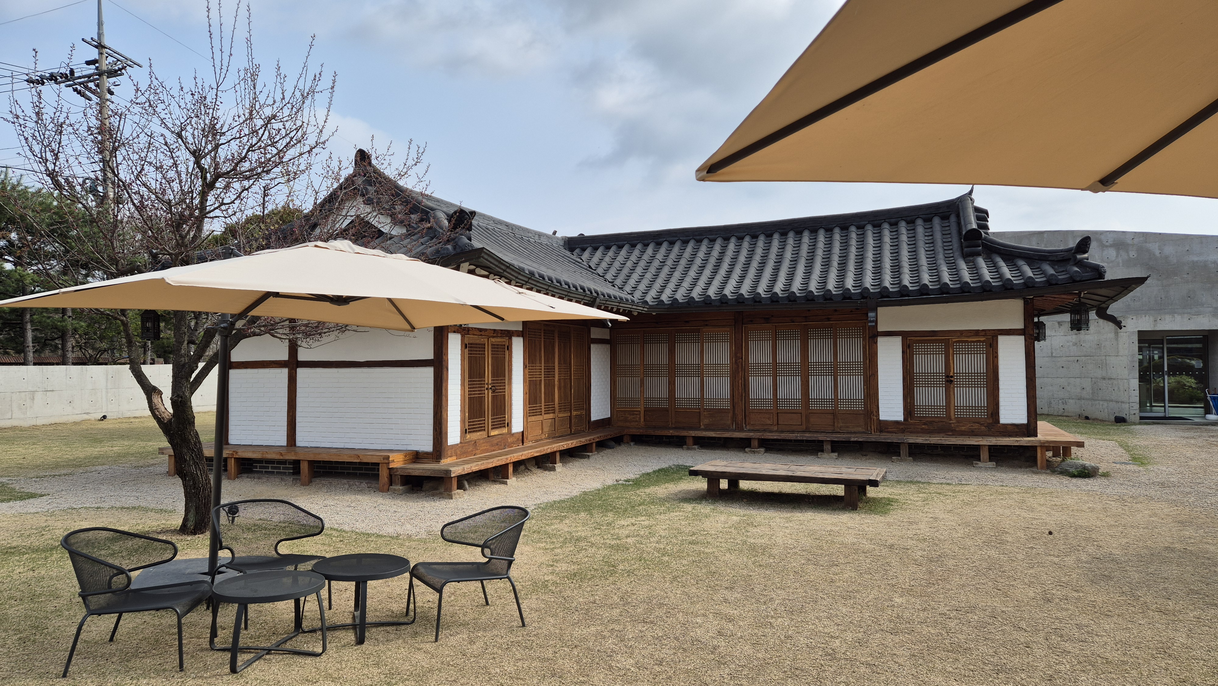 카페 주차장에 차를 세우고 들어가면 왼쪽에 카페 입구가 보인다. 오른쪽에 한옥 건물은 갤러리이며 그 뒤로 레스토랑으로 사용 중인 별장과 정원이 보인다.