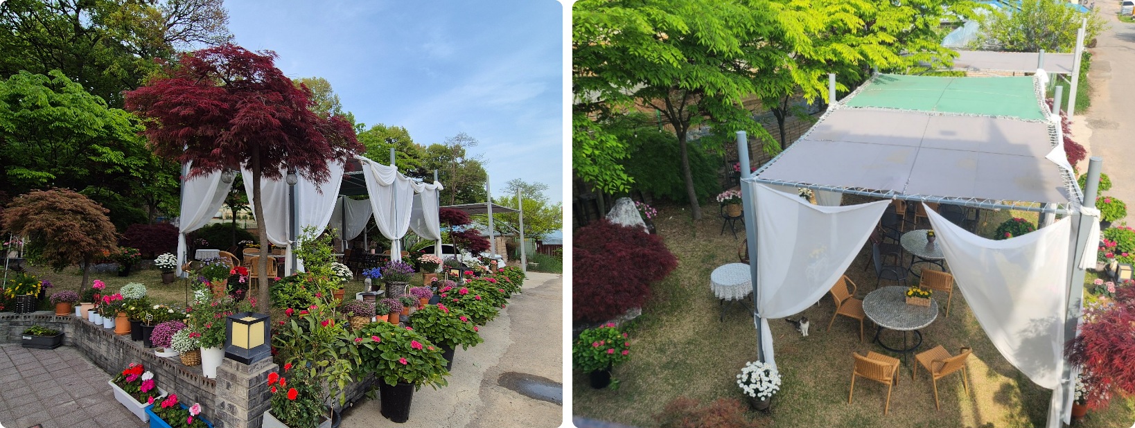 건물 밖 오른쪽 1층에는 흰색 햇빛 가림막 아래에 야외 테이블도 있다.