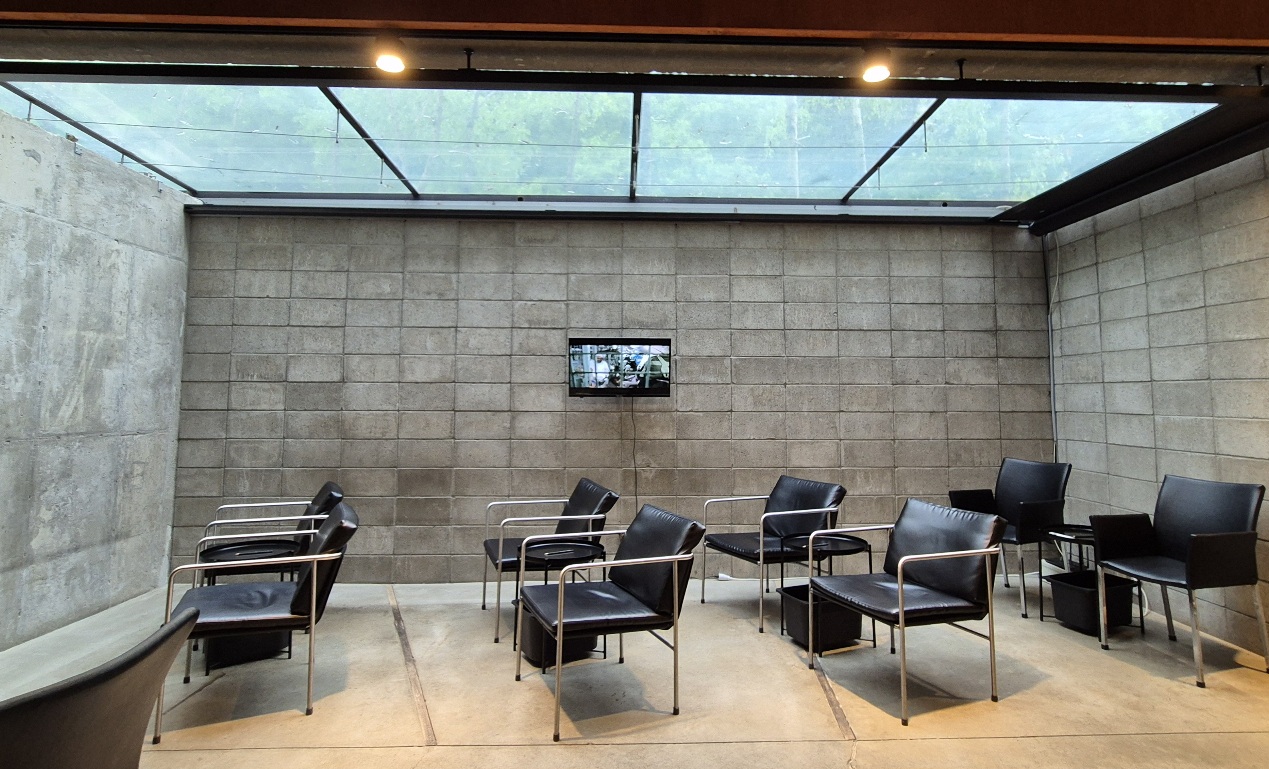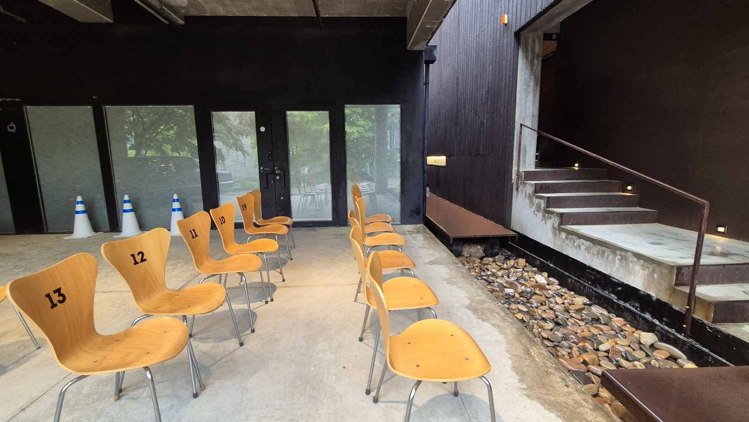 회색건물 왼쪽으로 돌아가면 대기하는 의자가 보이고 그 앞에 입구로 이어지는 긴 계단이 있다.
