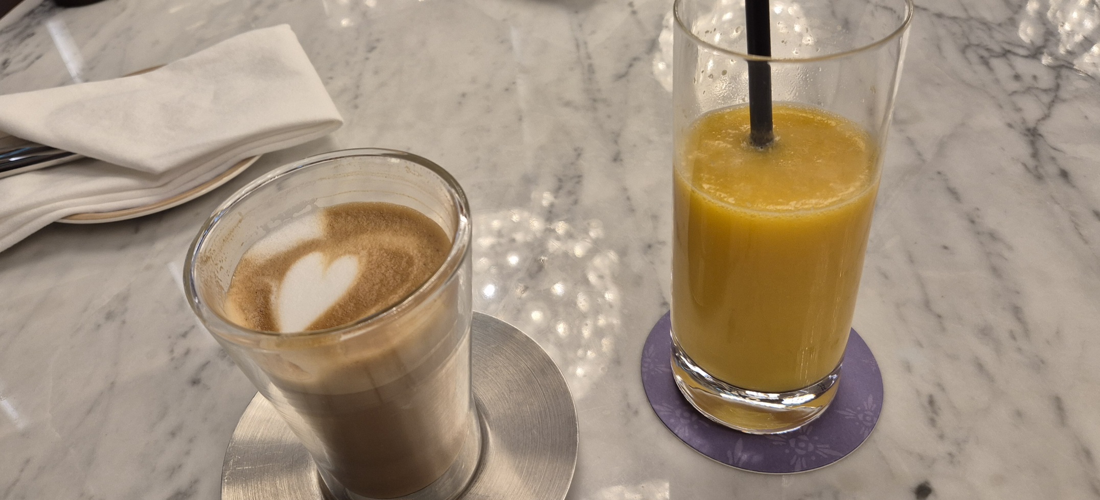 음료는 커피와 주스 중에서 선택이 가능하며 1인 1 메뉴를 주문하면 아메리카노로 리필이 가능하다.