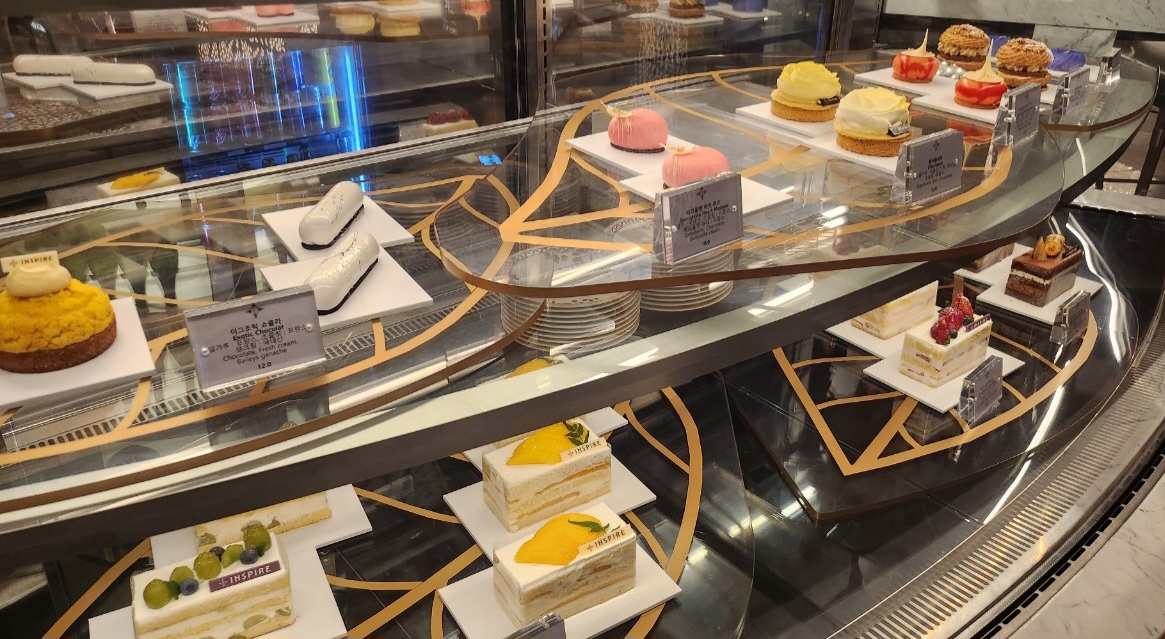 가운데 큰 기둥을 둘러싸고 원형의 바테이블, 카운터, 케이크와 디저트 진열장이 있다.