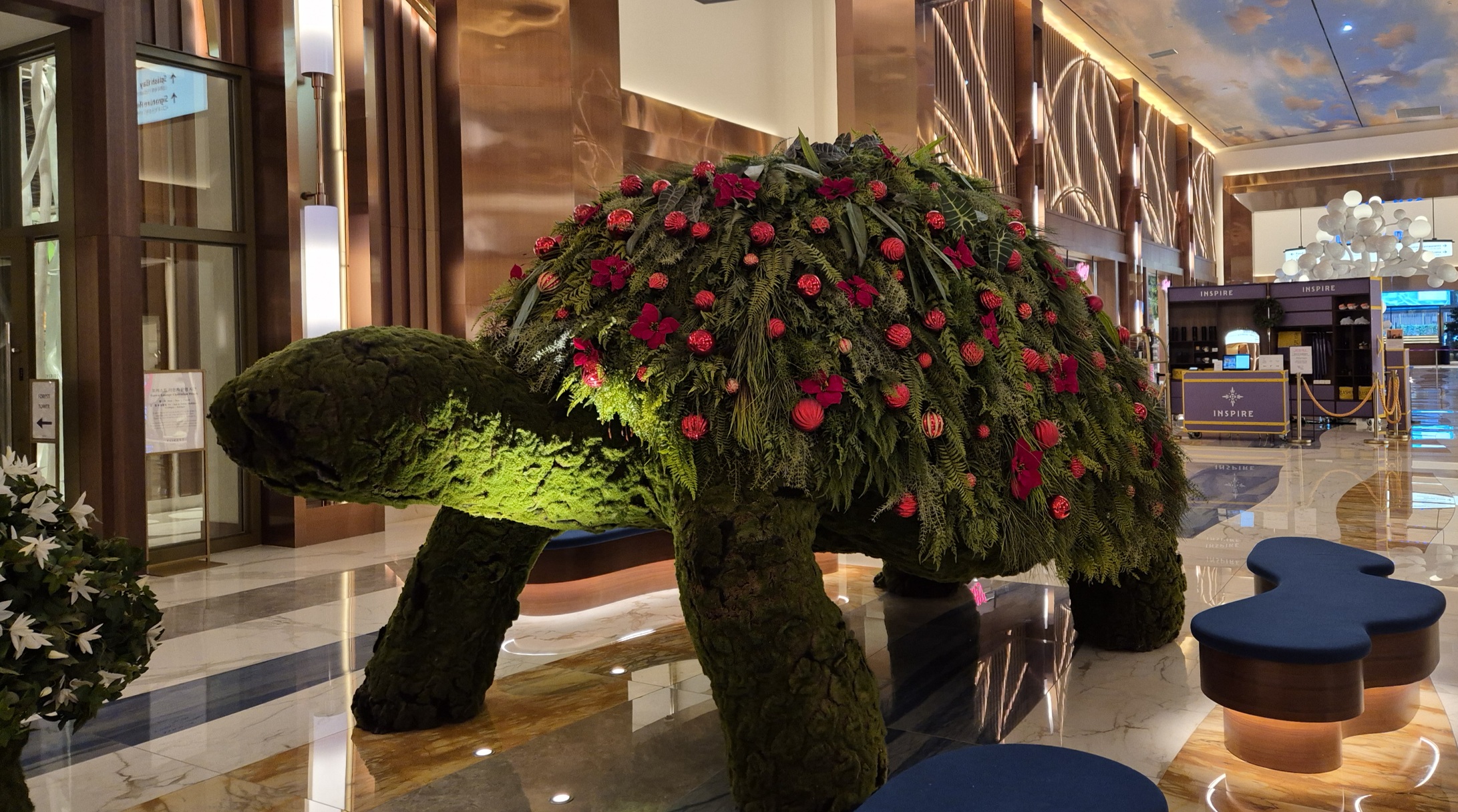 거북이도 크리스마스 시즌에 맞게 붉은색 꽃으로 장식되었다.