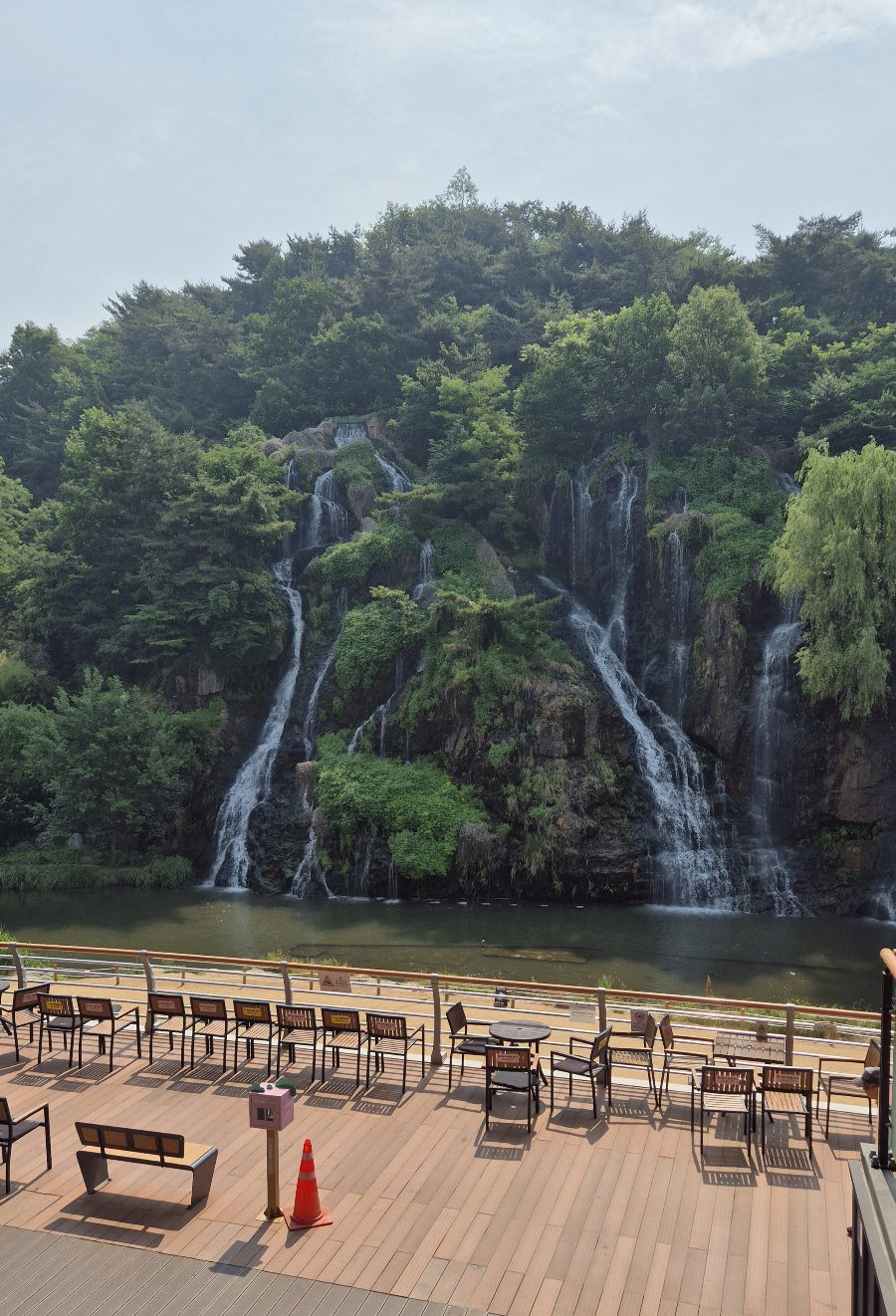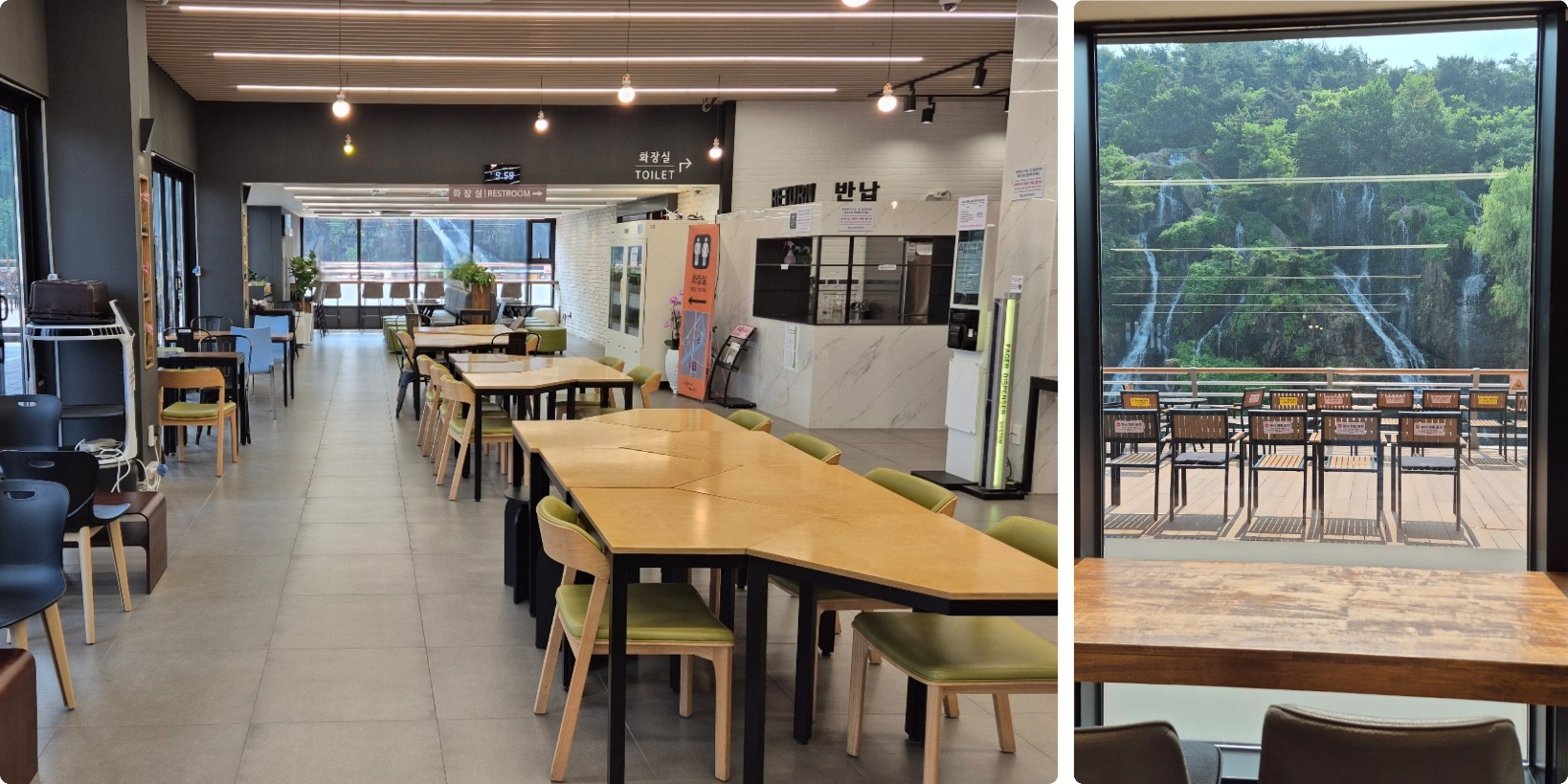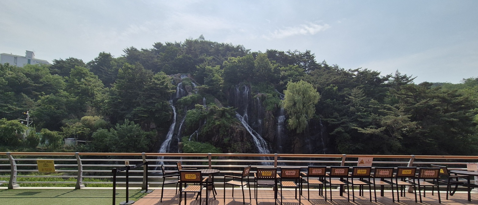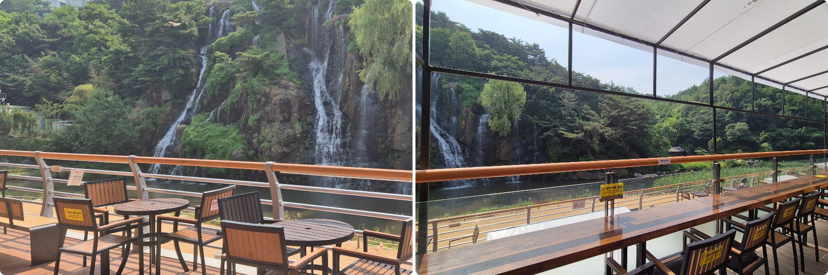 카페를 이용하지 않아도 폭포를 보며 쉴 수 있는 테이블이 1층과 2층 외부에 잘 구성되어 있다.