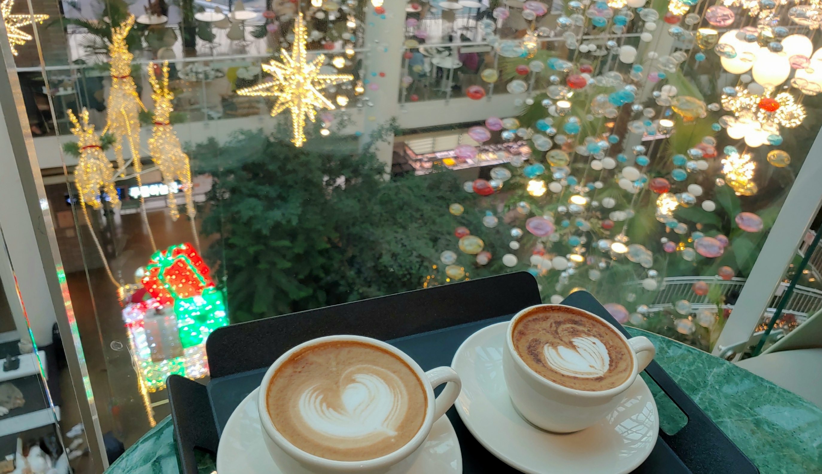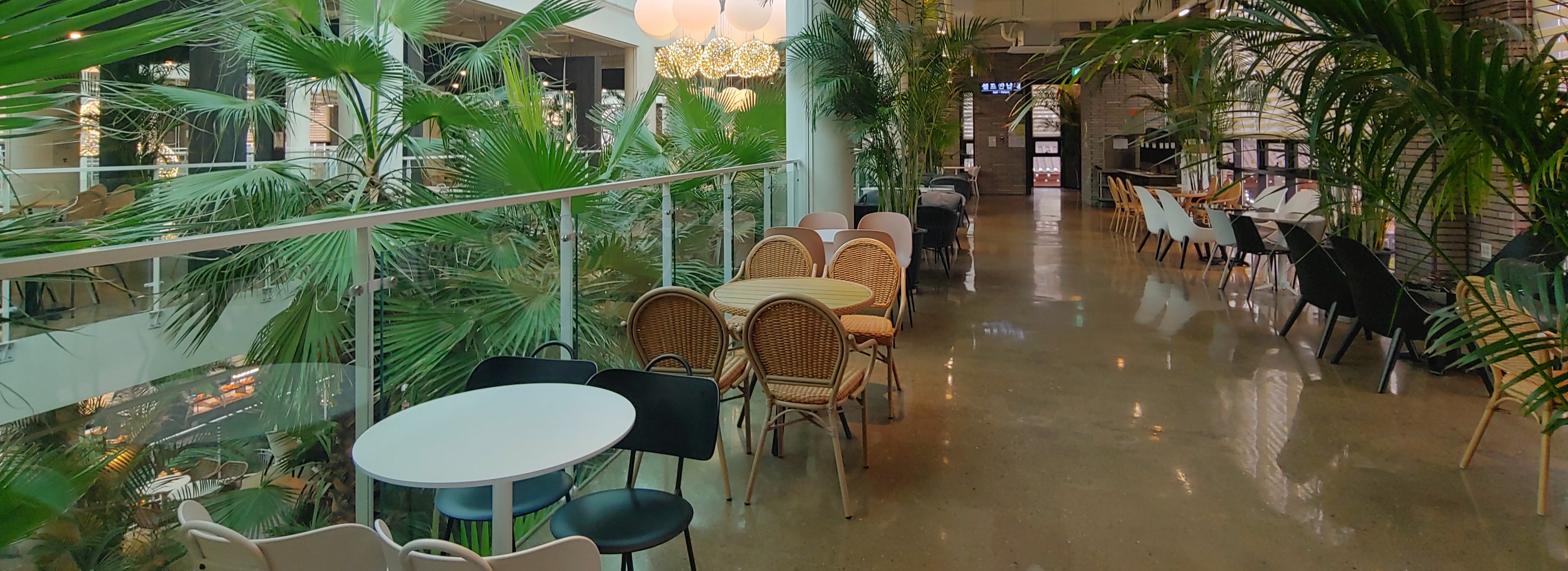 3층의 가운데 난간 자리에서는 1층부터 자라난 식물들과 천장의 장식물들을 가까이에서 볼 수 있다. 그 외에도 내부 다양한 공간에 테이블이 있다.