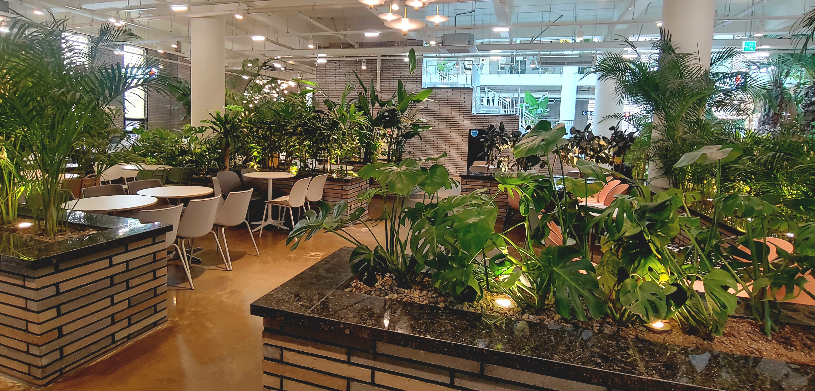 1층 엘리베이터에서 내리면 초록초록한 식물들이 먼저 눈에 들어온다. 가운데 공간은 3층까지 뚫려 있어서 개방감이 좋다.