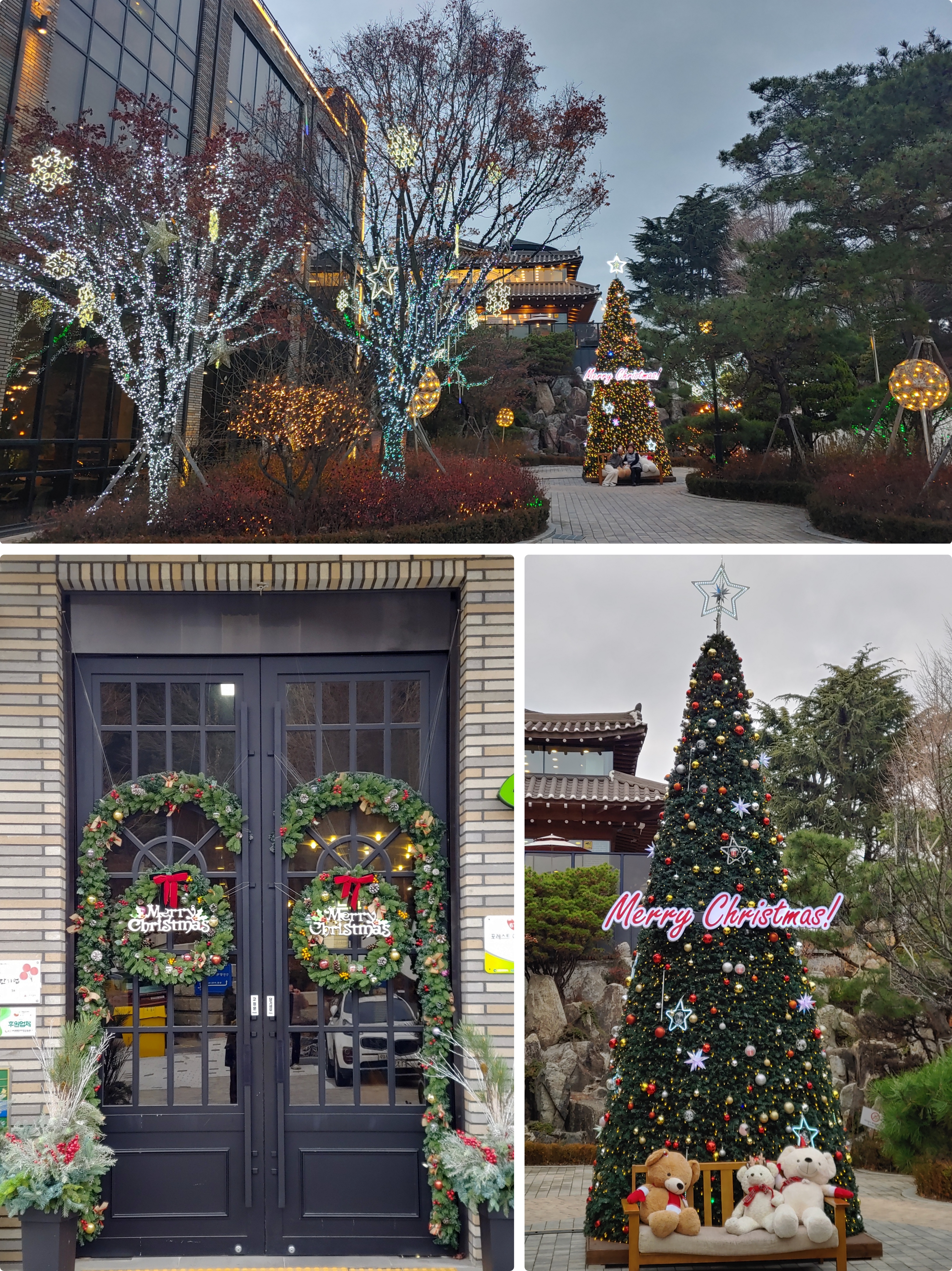 카페 1층 외부부터 출입문까지 크리스마스트리와 전구가 장식되어 있다.