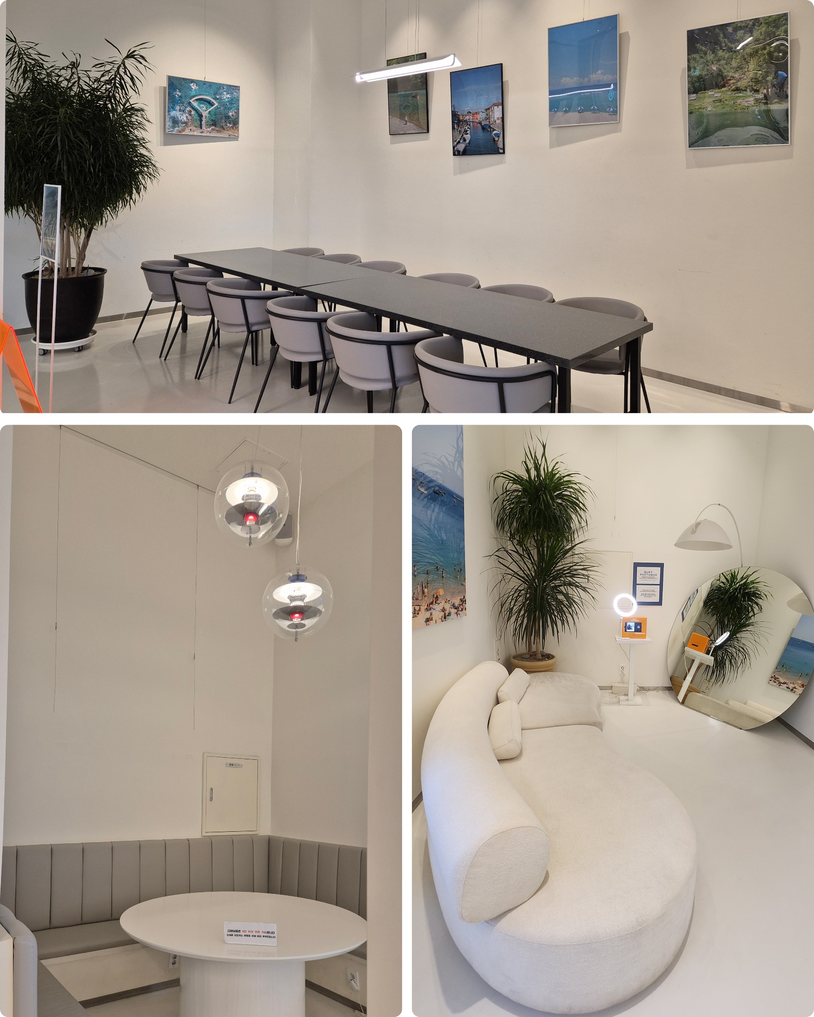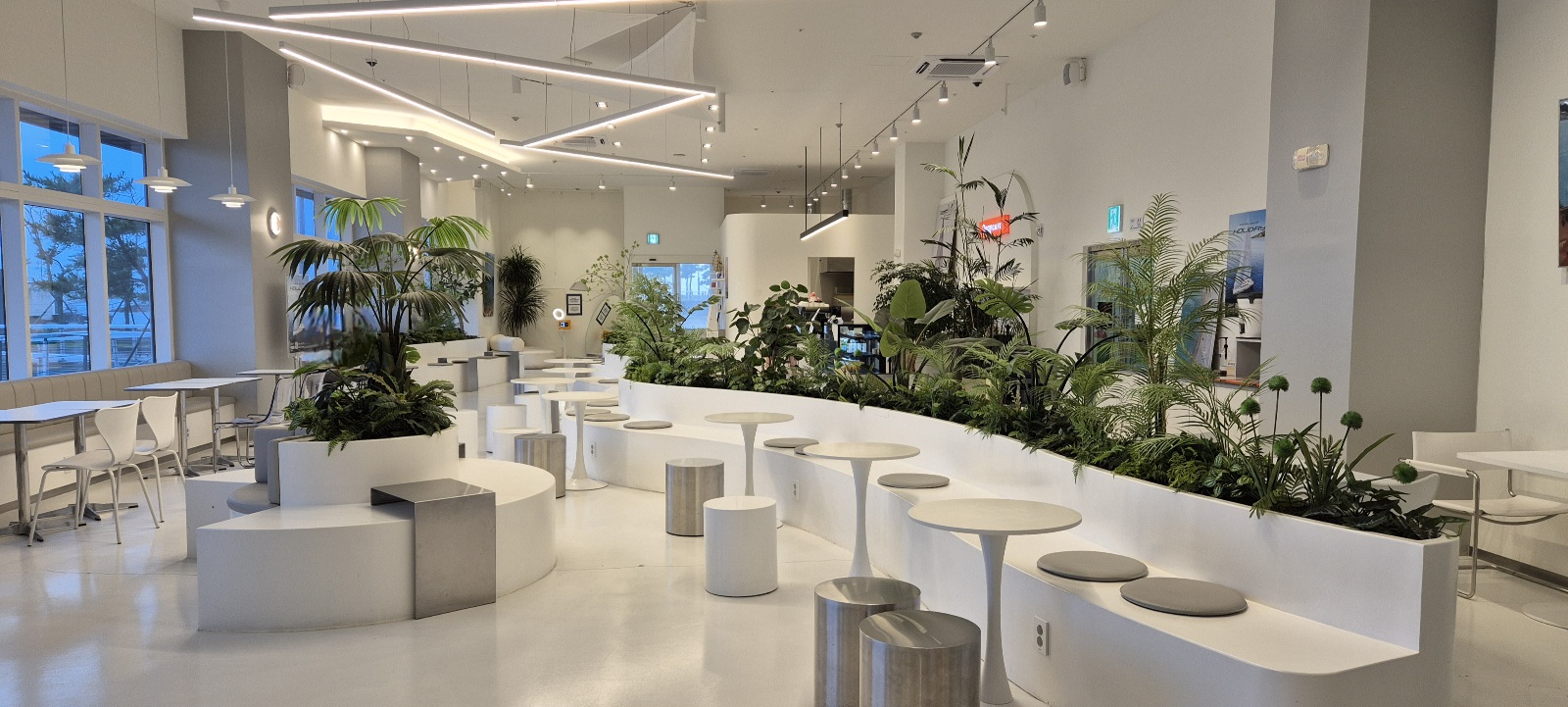 창가 자리가 아닌 내부에는 곡선 화단 앞의 자리, 12인석 대형 테이블, 소파 자리등 다양한 형태의 좌석이 있다.
