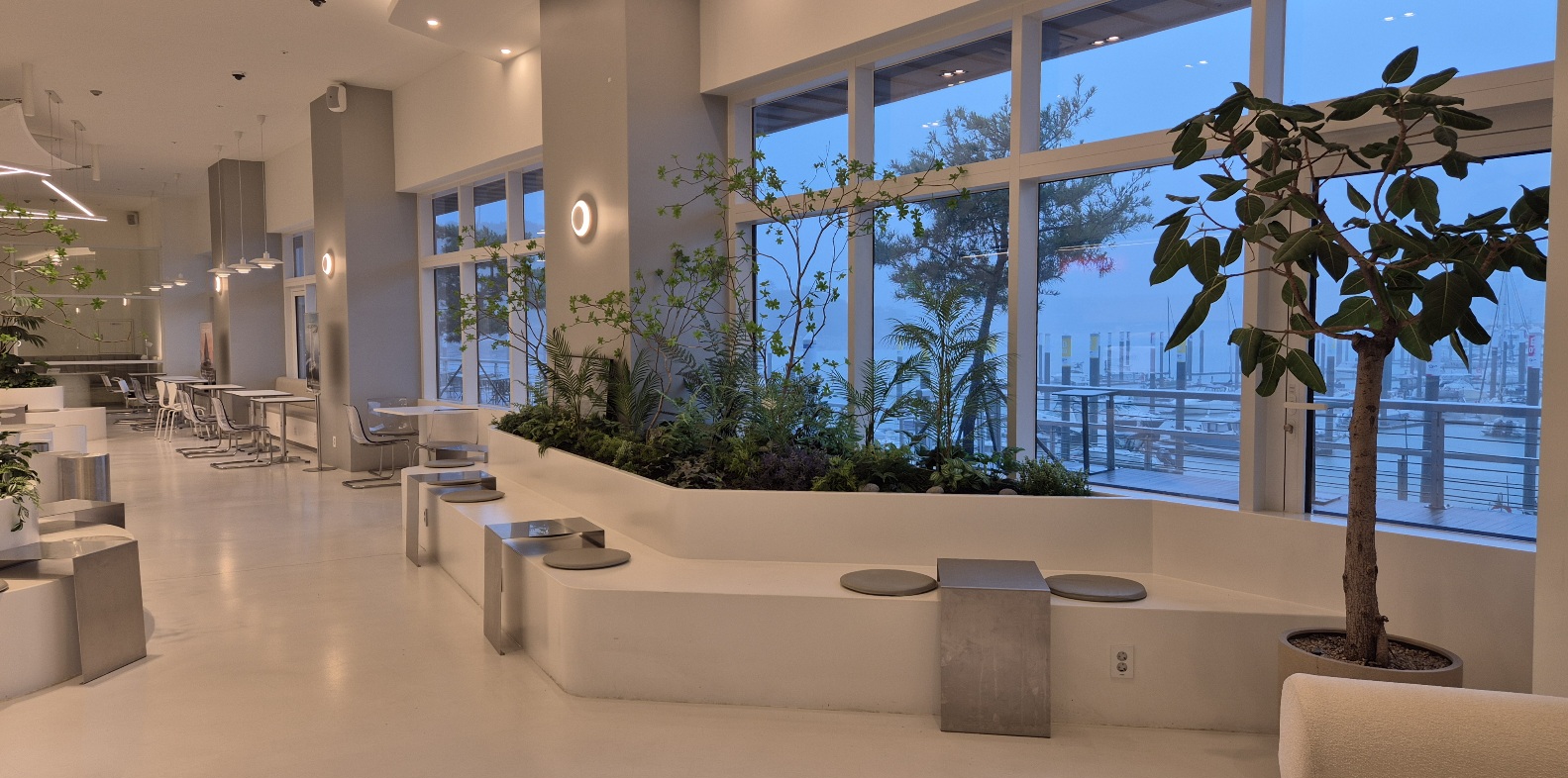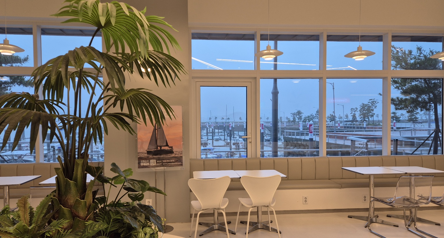 왼쪽에는 카운터가 있고 오른쪽에는 요트 선착장이 보이는 창문이 있다.