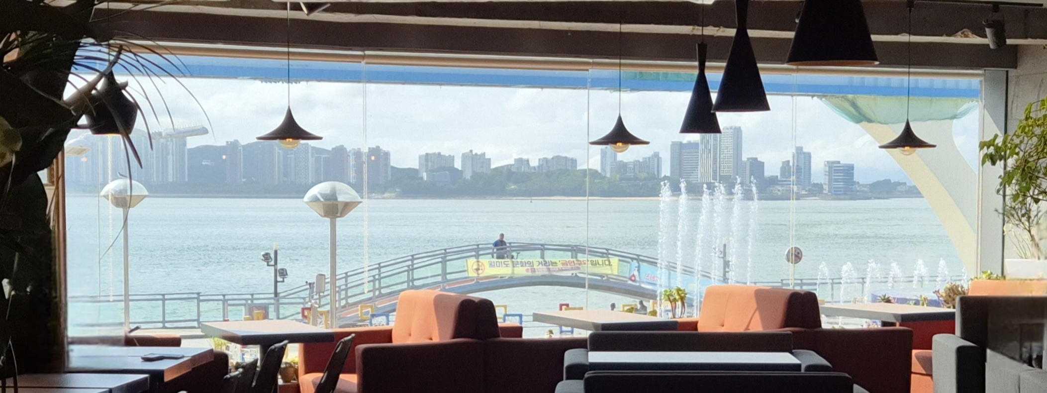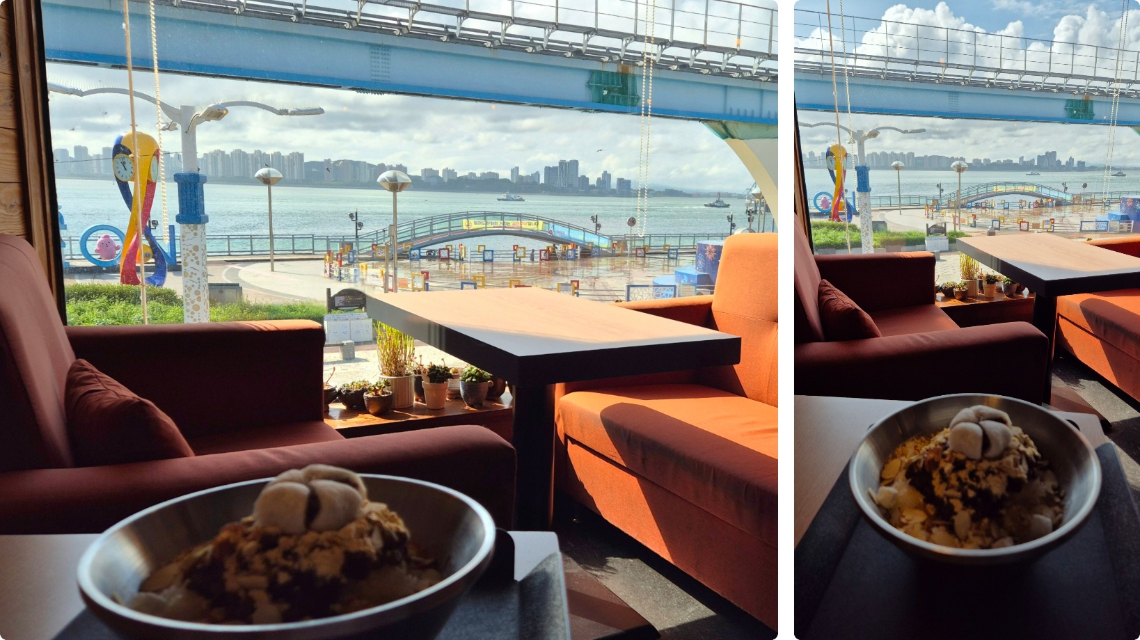 카페 창 밖으로 월미도 모노레일이 지나가는 것을 볼 수 있다.
