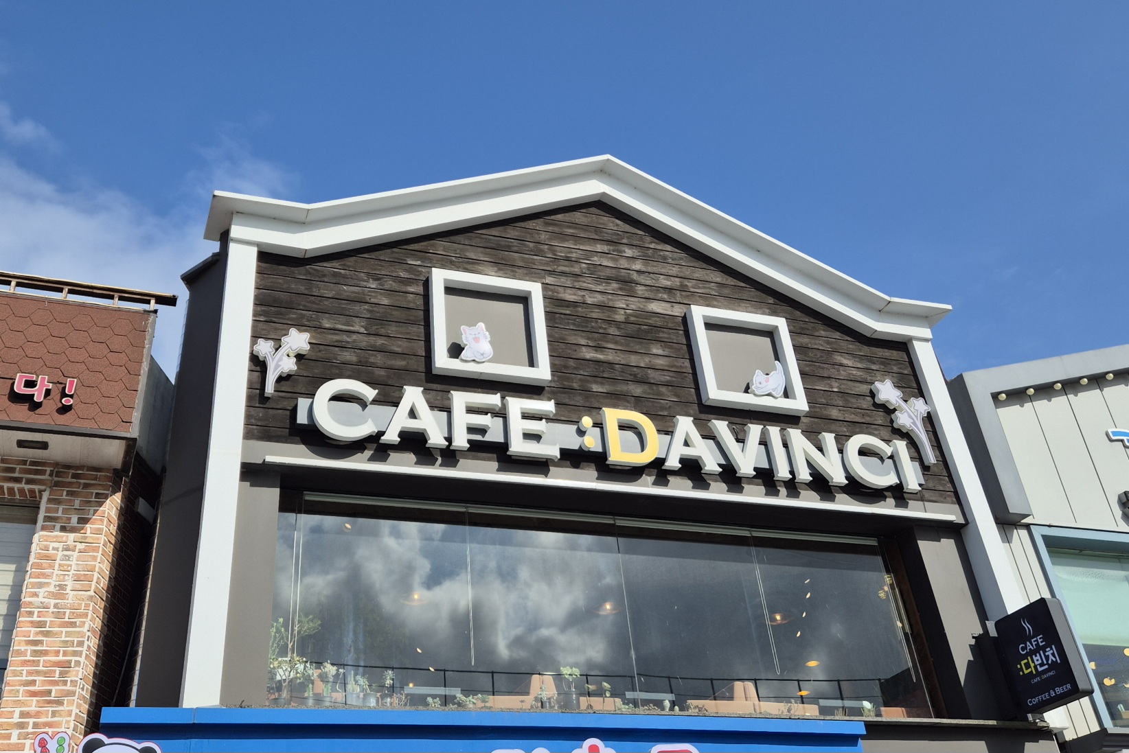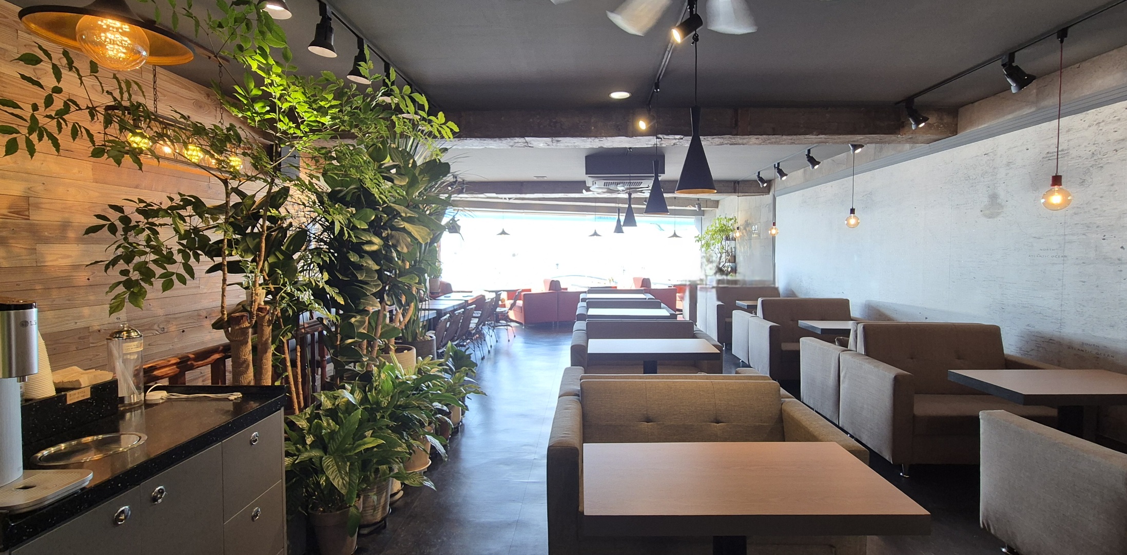 바닷가의 2층 건물들이 늘어선 길의 2층에 위치하고 있어서 통유리창 앞자리에서는 바다가 잘 보인다.