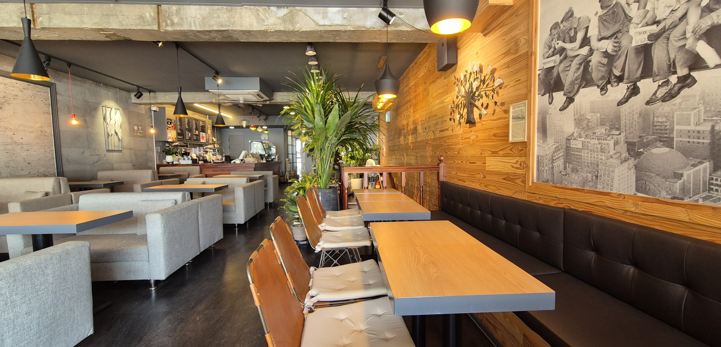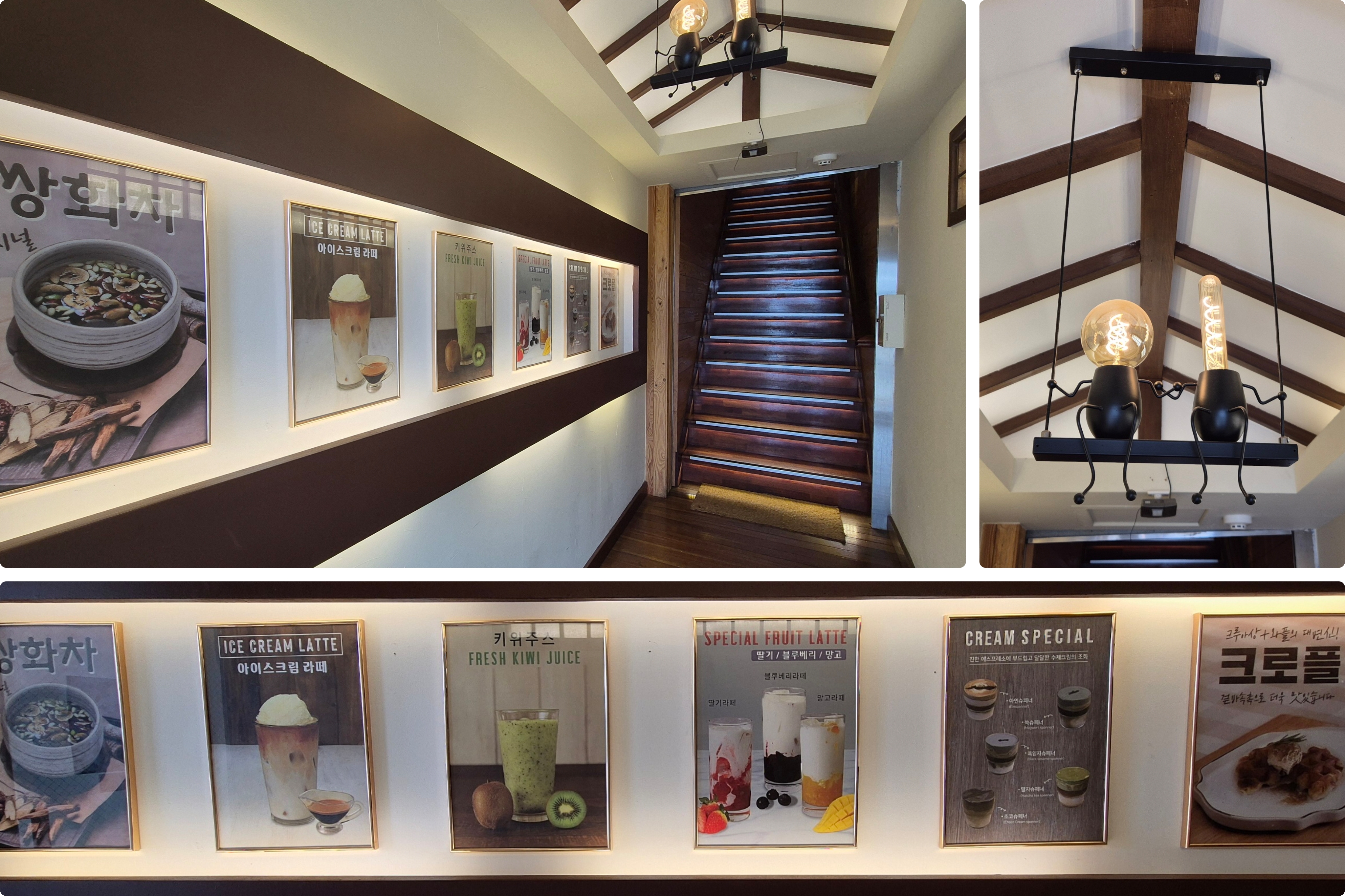 천장에는 사이좋게 그네를 타고 있는 2개의 전등이 보인다. 왼쪽 벽에는 추천 메뉴 사진이 있다.