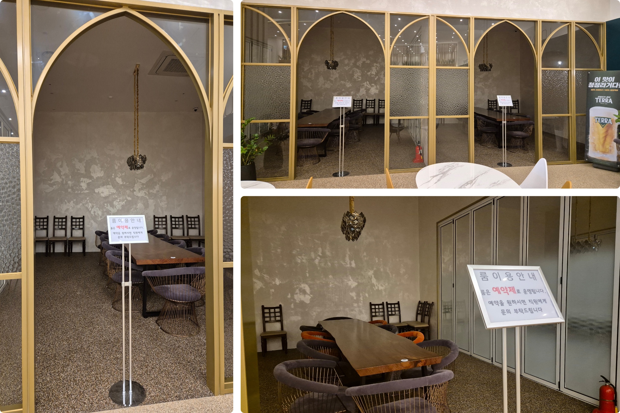 들어가면서 왼쪽에 보이는 룸은 사전 예약을 하고 사용할 수 있다. 3개의 방이 폴딩도어로 나뉘어 있어서 크게 하나로 합쳐서 사용할 수도 있다.