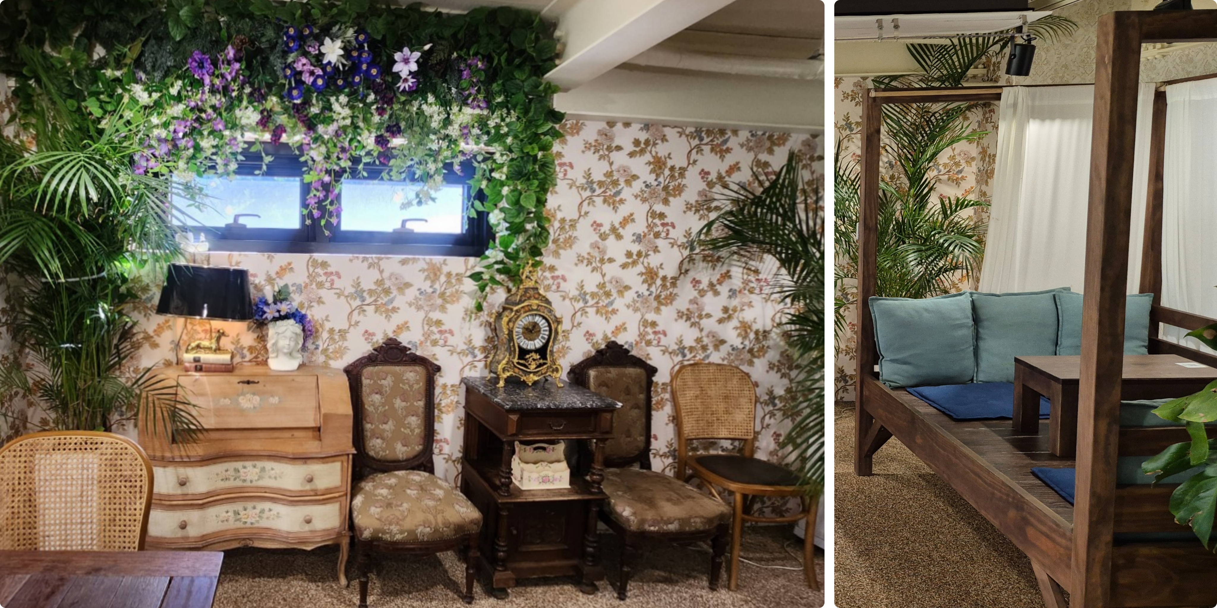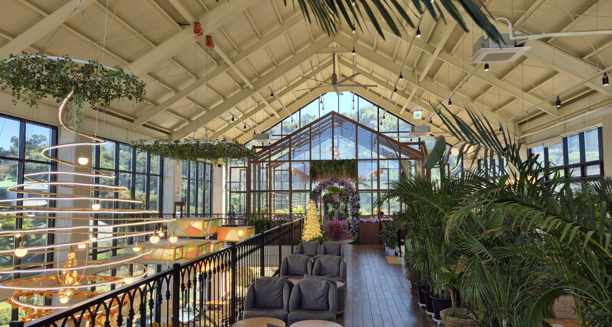 실내 난간과 창가에는 4명이 앉을 수 있는 소파 자리가 있다. 카페 내부의 장식이 잘 보이고, 창가 자리에서는 야외 정원이 잘 보인다.