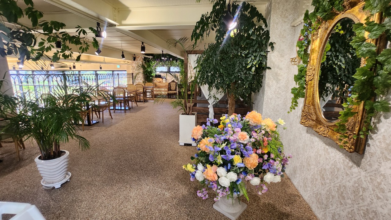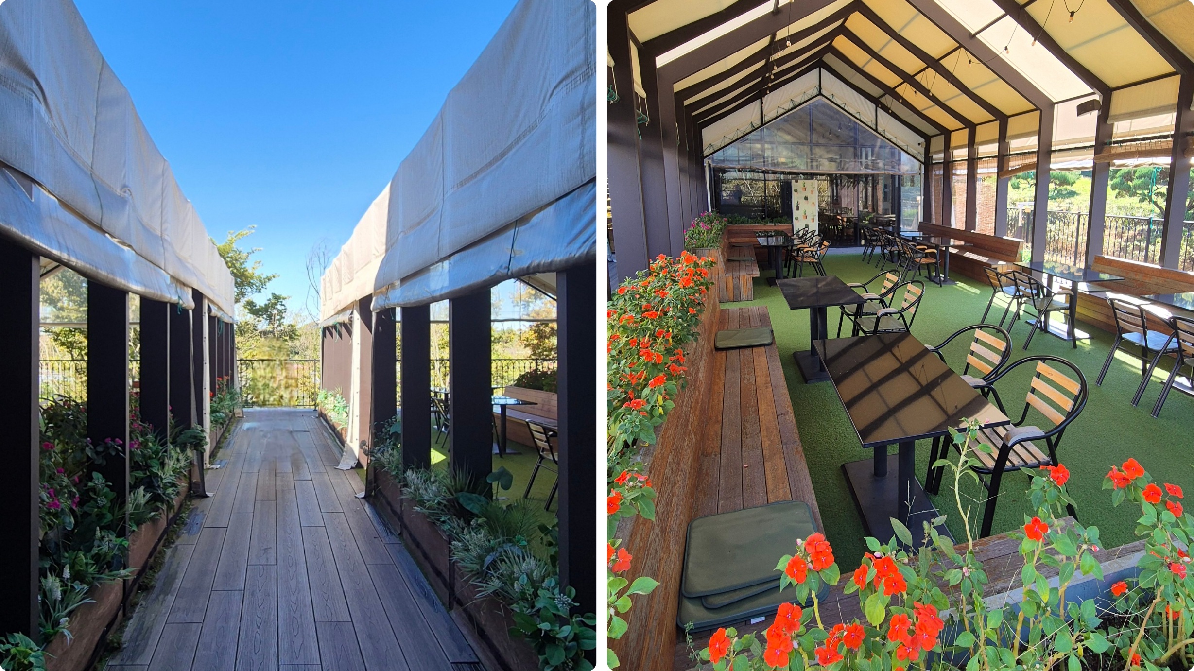 반대편으로 나가면 야외 공간이 나온다. 화분으로 둘러싸인 천막아래 테이블과 좌석이 있다.