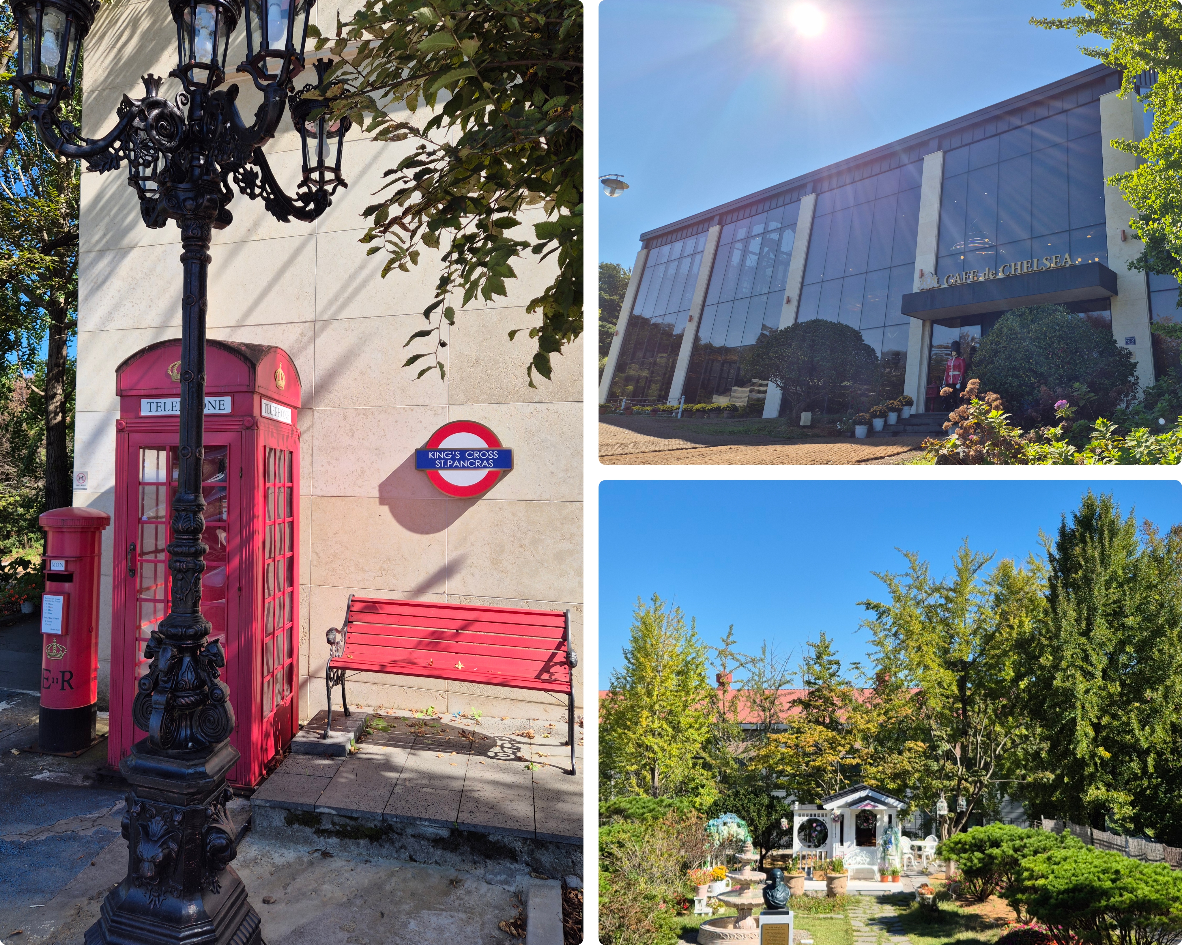 산책로를 한 바퀴 돌면 처음의 주차장이 나온다. 주차장 앞에는 영국의 빨간 전화부스와 지하철 표지판이 보인다. 날씨 좋은날 정원 산책과 함께 커피 마시기 좋은 추천 카페다.