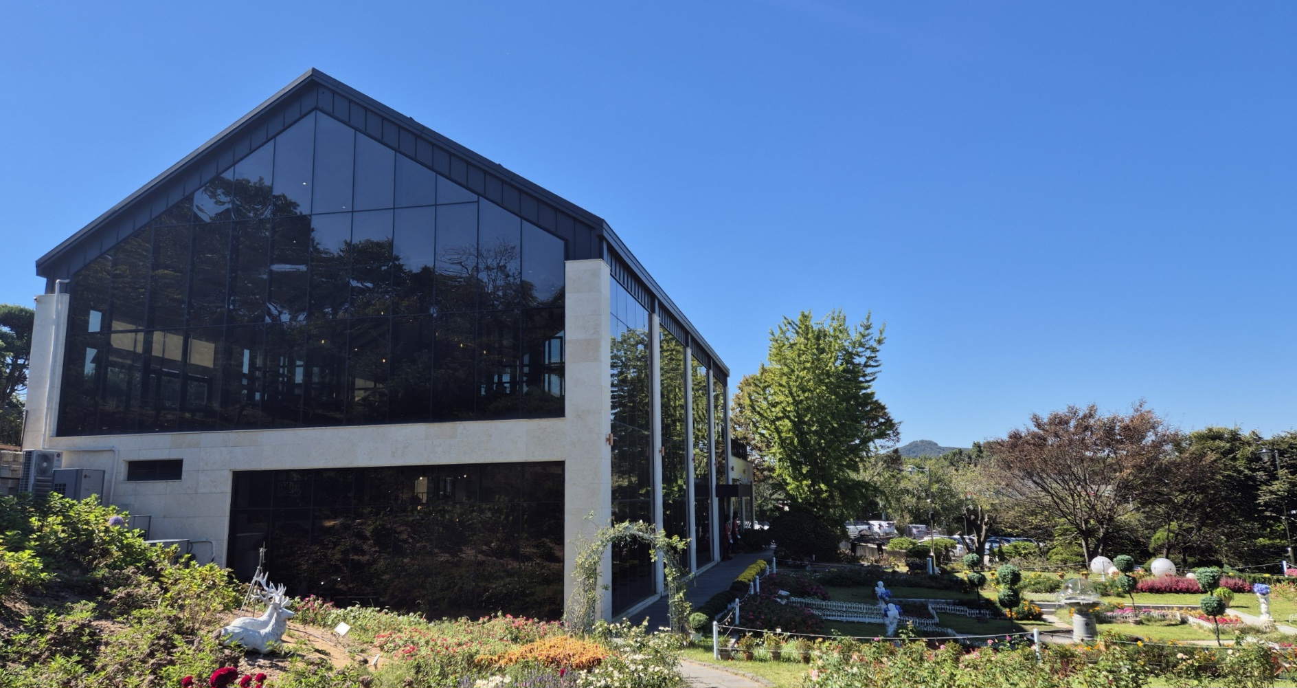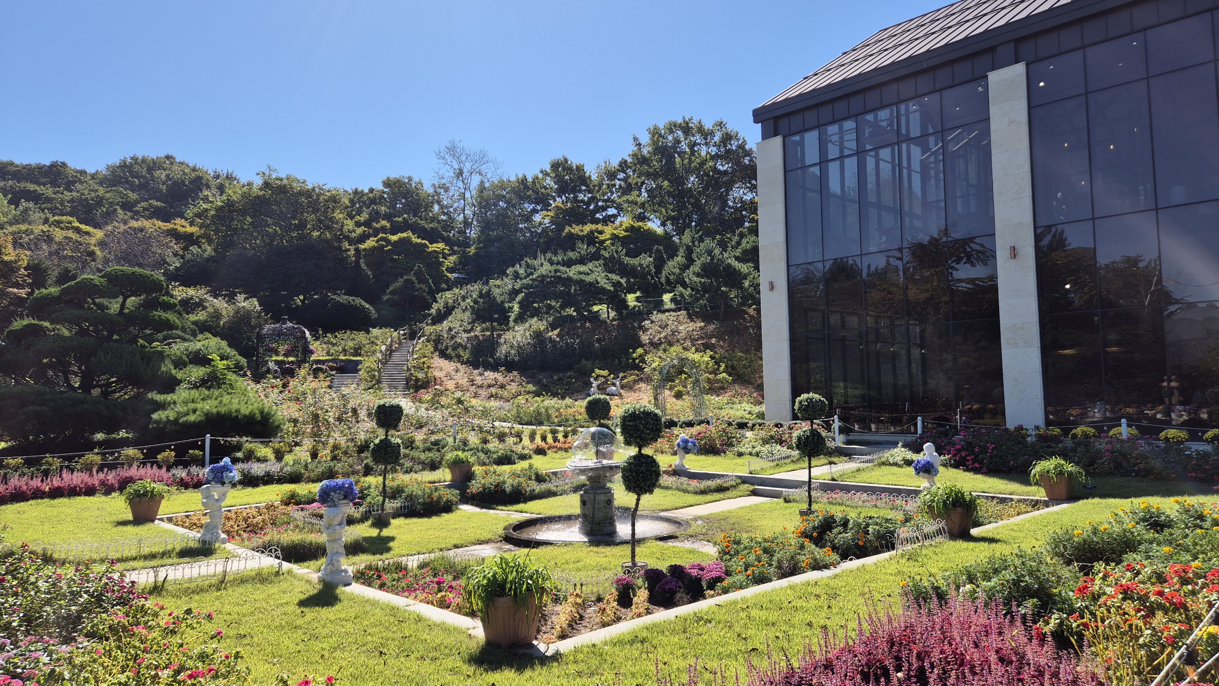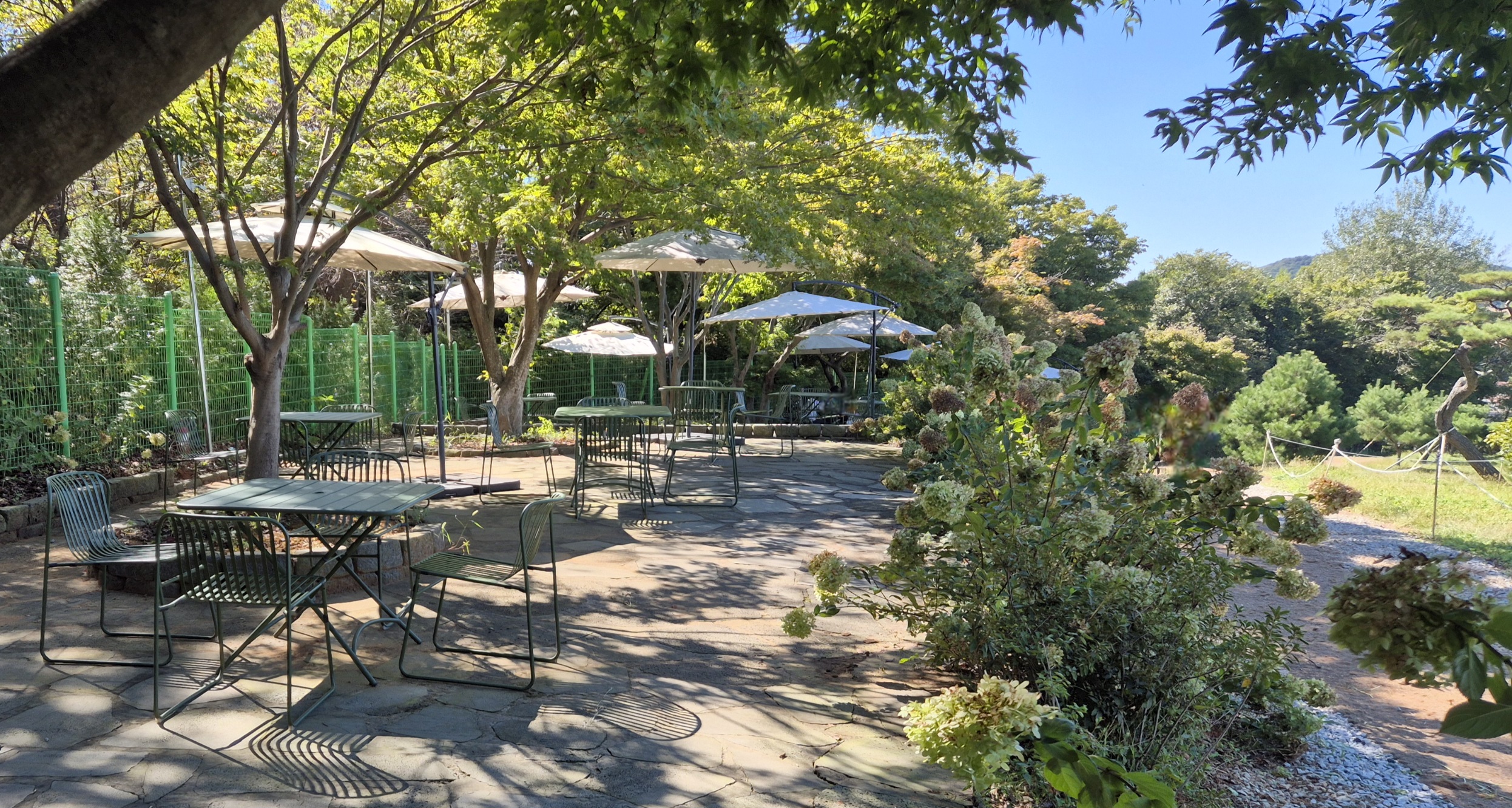 야외로 나가면 카페 건물 바로 앞에 작은 정원이 있고 카페 왼쪽으로 산책로로 올라가는 계단이 보인다.