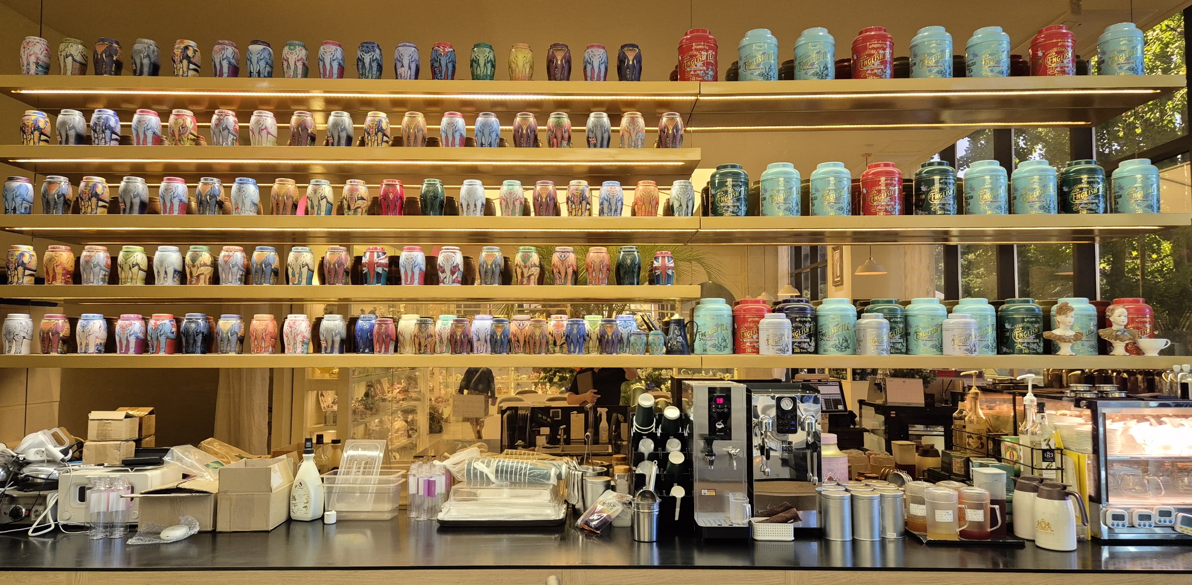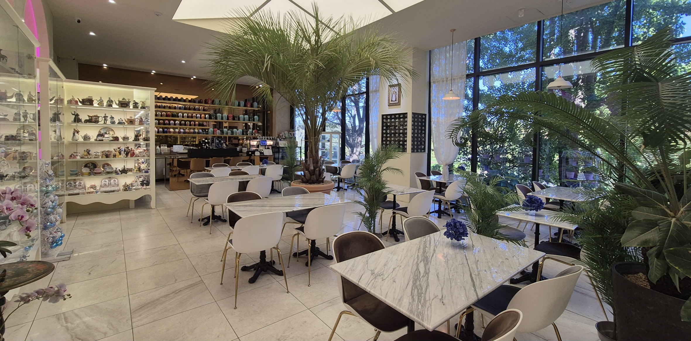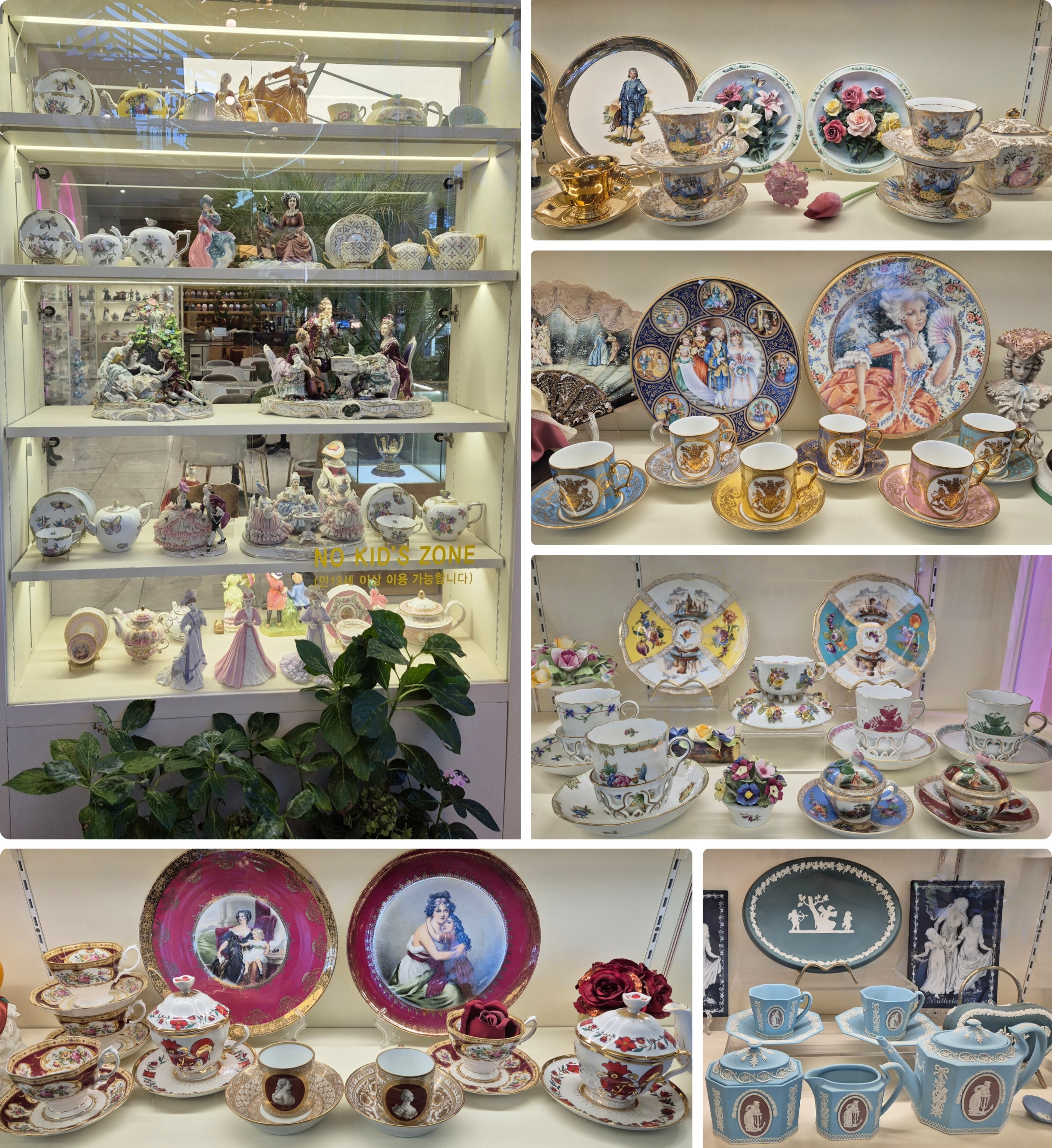 티룸에는 다양한 찻잔 세트가 전시되어 있다. 메뉴 중 에프터눈 티 세트를 마시는 곳이기도 하다.