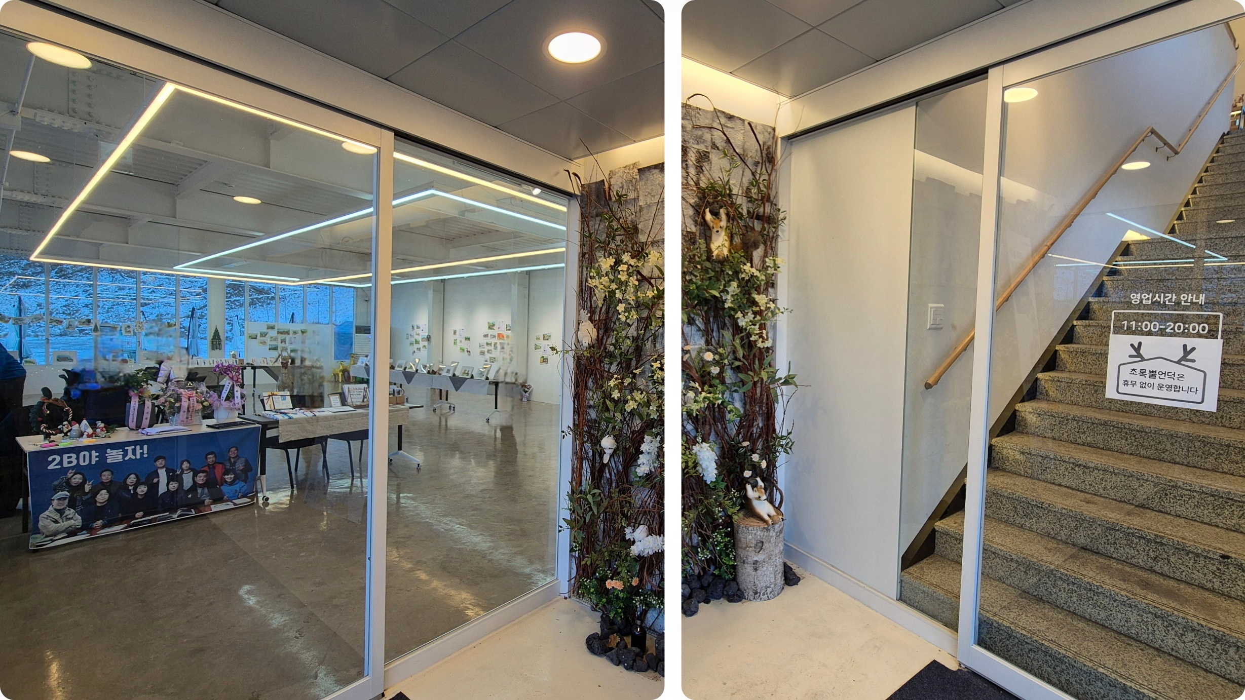 1층 입구로 들어가면 왼쪽에 전시장이 보이고 오른쪽에 2층 카페로 올라가는 계단이 보인다.