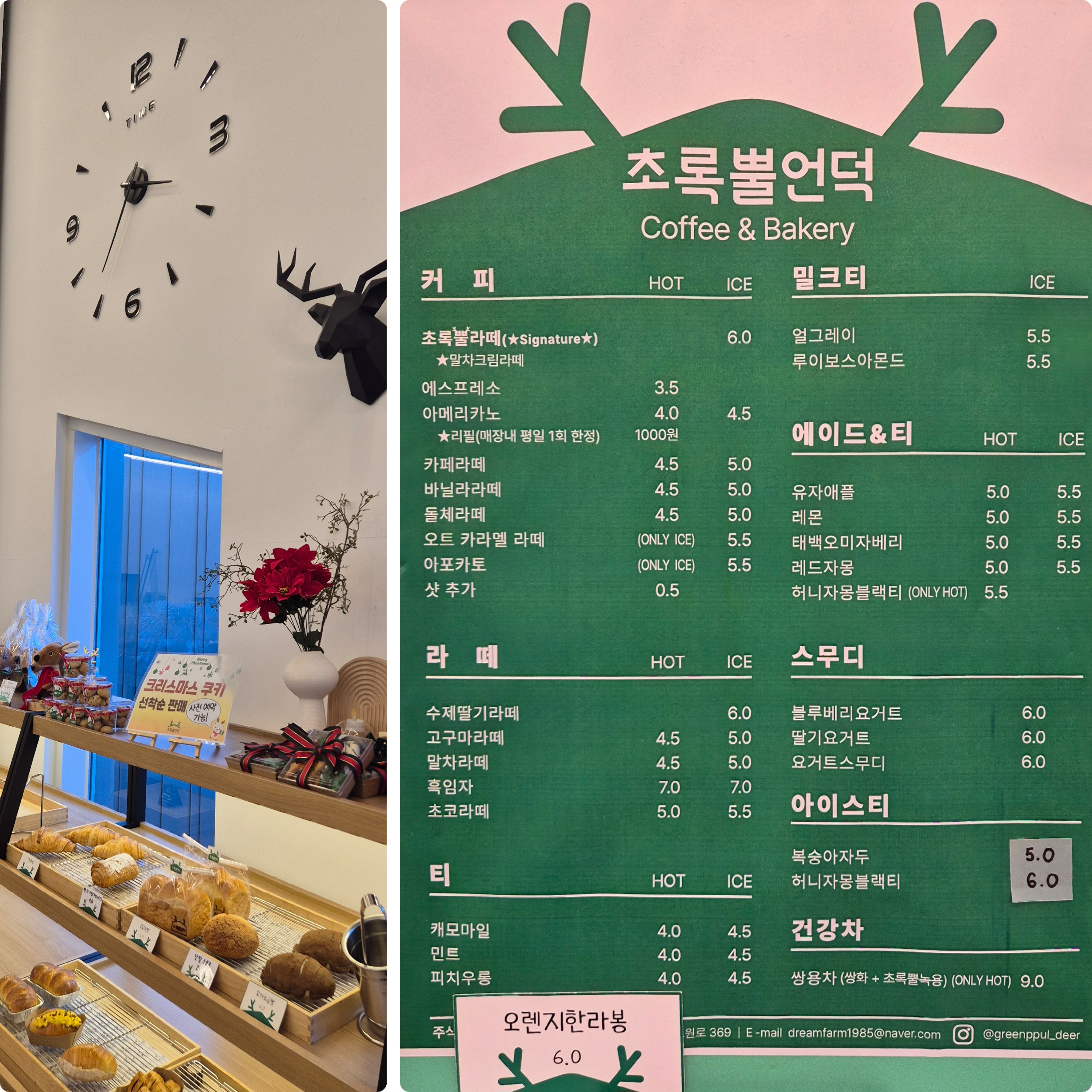 시그니처 메뉴는 초록뿔라떼이다. 메뉴판과 스푼의 손잡이에 사슴뿔 모양 장식이 있다.