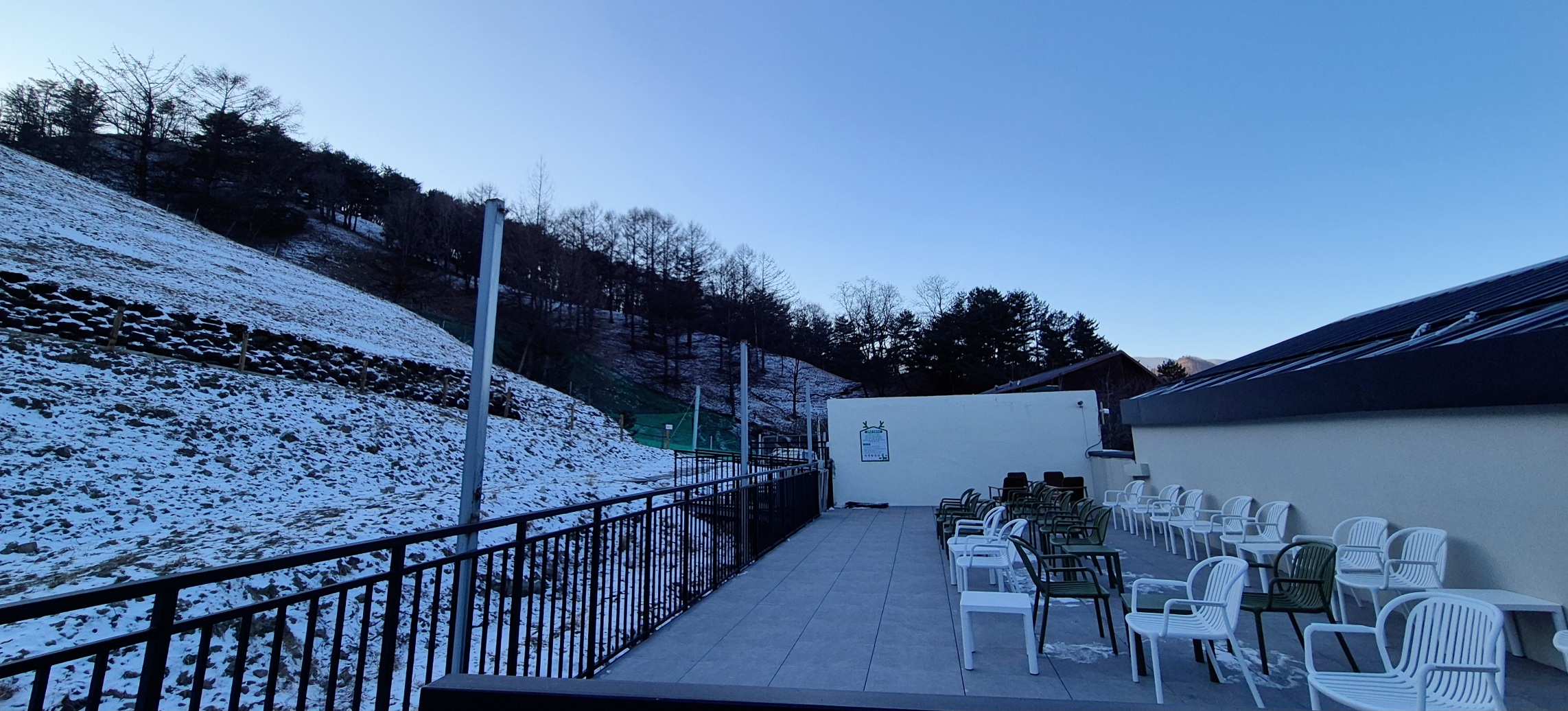 오른쪽에 2층 발코니로 나갈 수 있는 문이 있으며 발코니에는 사슴이 있는 언덕을 향한 의자가 몇개 놓여 있다. 밥 주는 시간 때가 아니었지만 꽤 여러마리의 사슴을 볼 수 있었다.