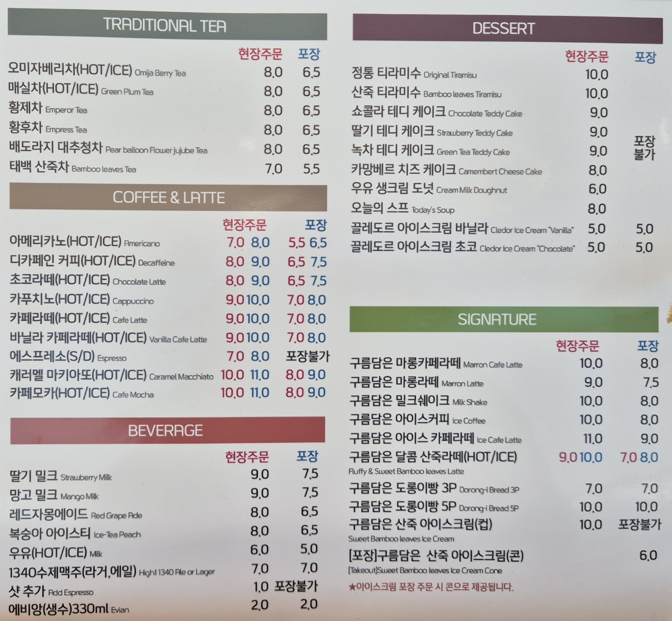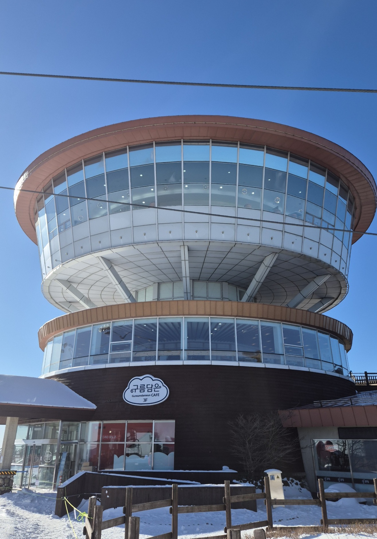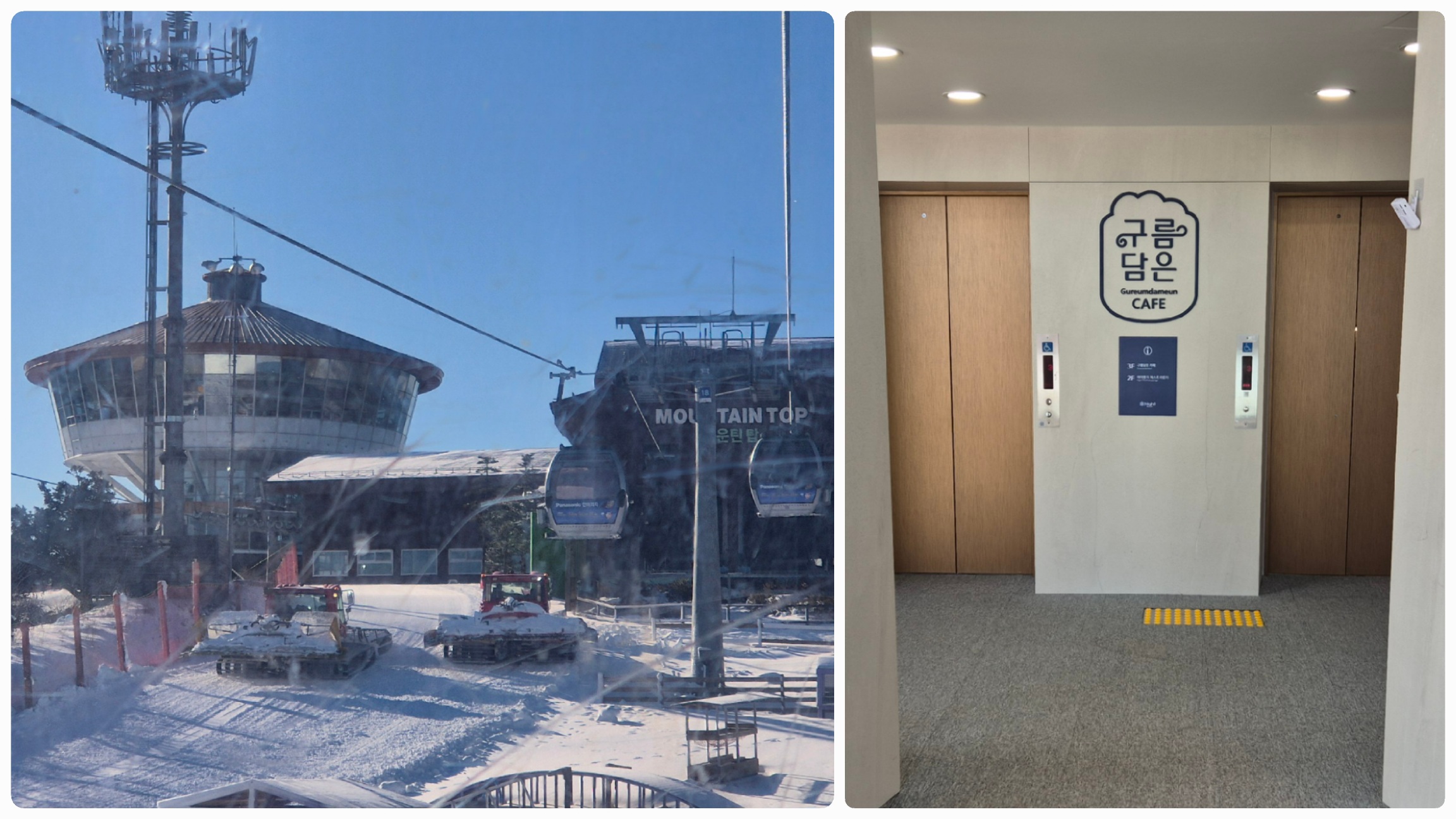 케이블카나 리프트를 타고 올라가면 보이는 3층 건물로 들어가면 1층 엘리베이터에 구름담은카페 안내가 있다.