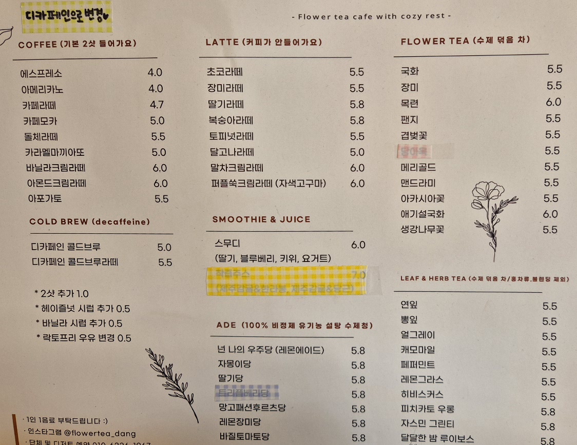 그 옆의 메뉴판에는 꽃차 이외의 커피와 음료도 있다.