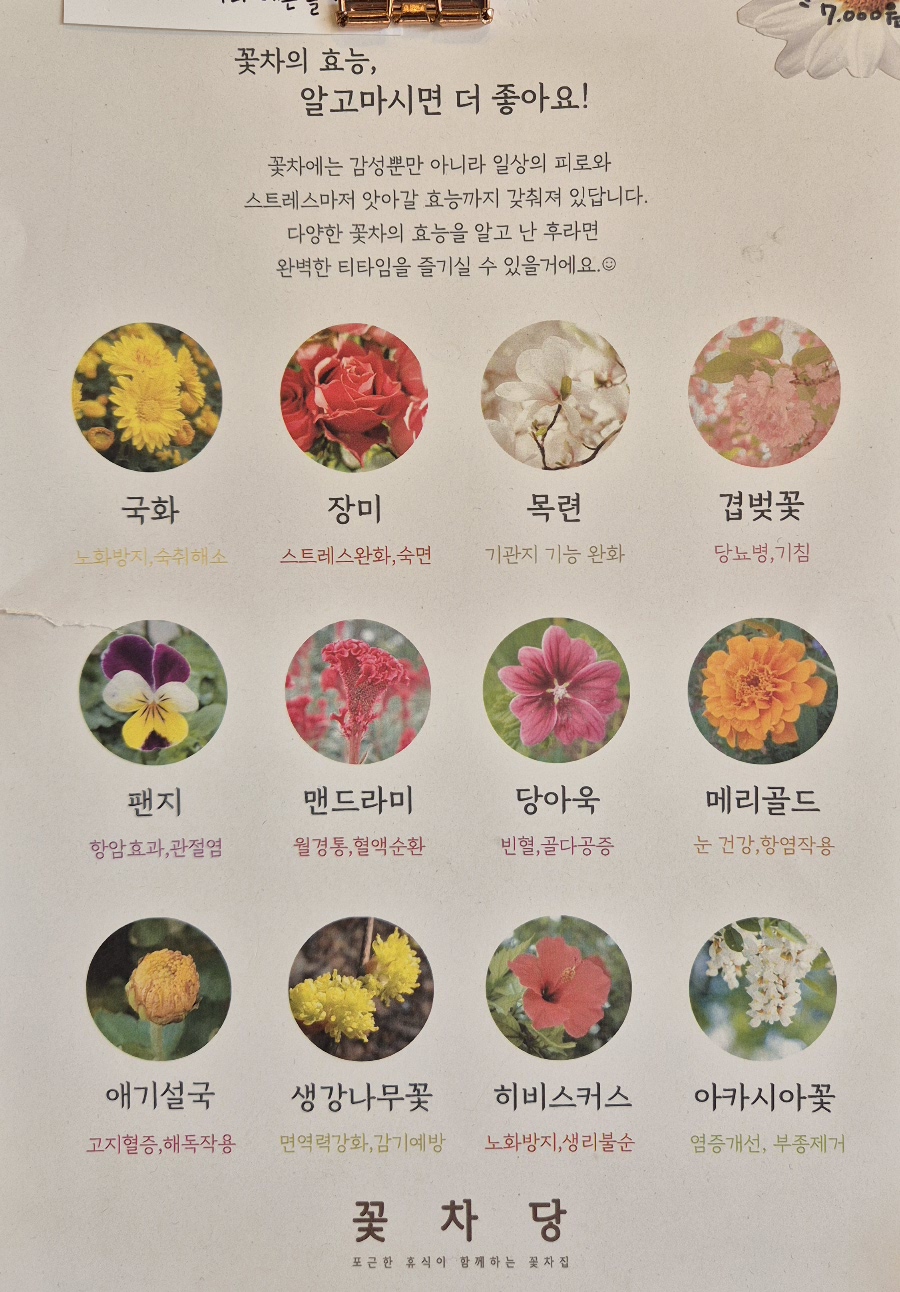 카운터에는 꽃차의 효능이 적혀 있어서 주문 시 참고하기 좋다.