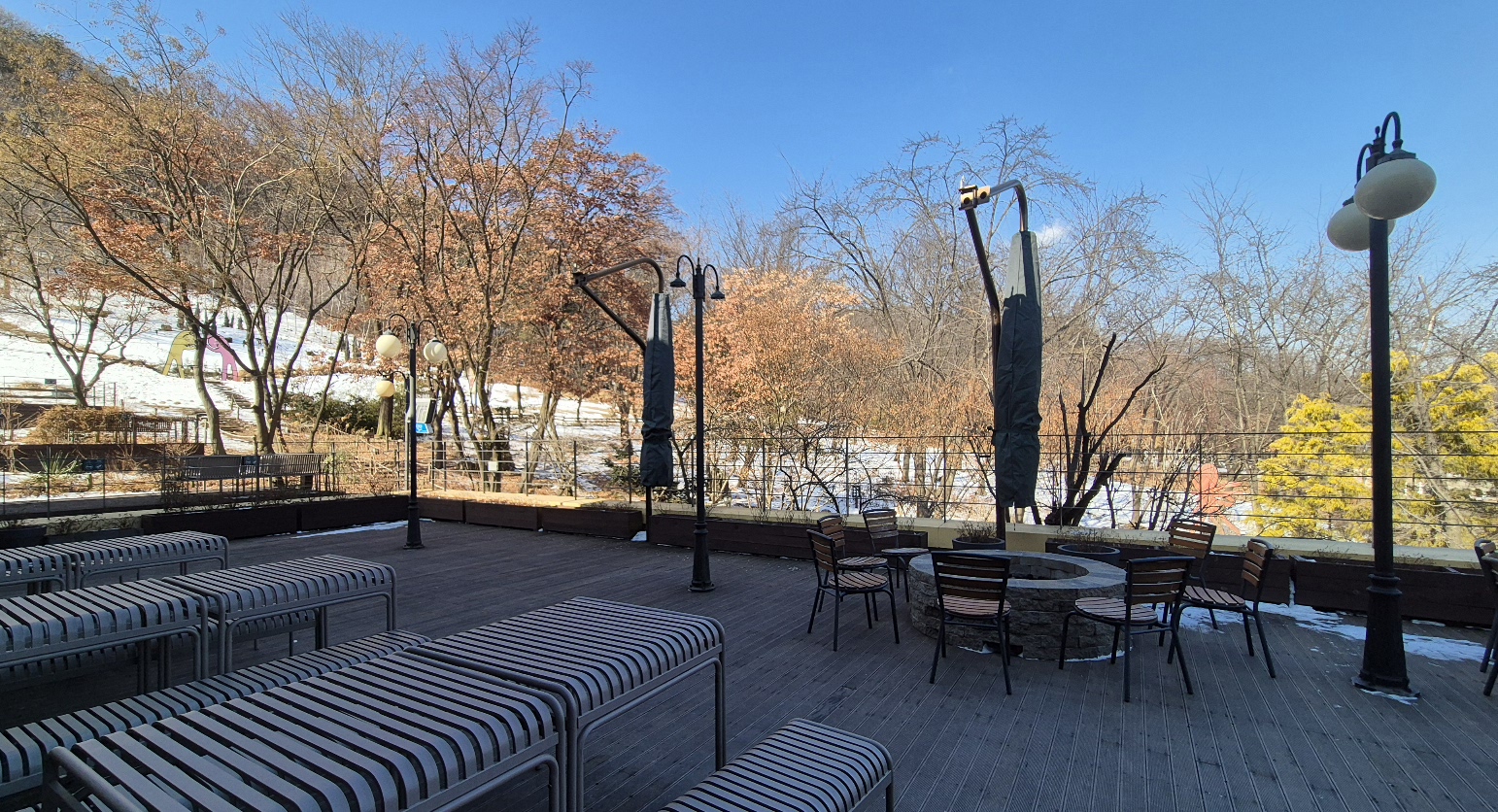 식물공방 오른쪽에 있는 문으로 나가면 야외 테라스와 수목원으로 이어지는 길이 있다.