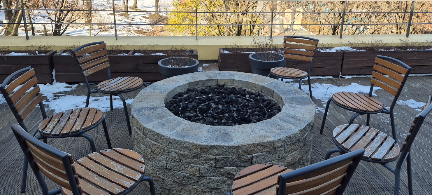 통창 너머 보이는 테라스에는 불을 피울 수 있는 화덕도 있다.