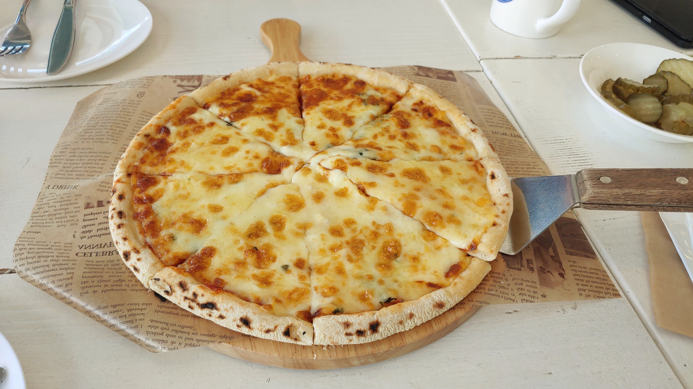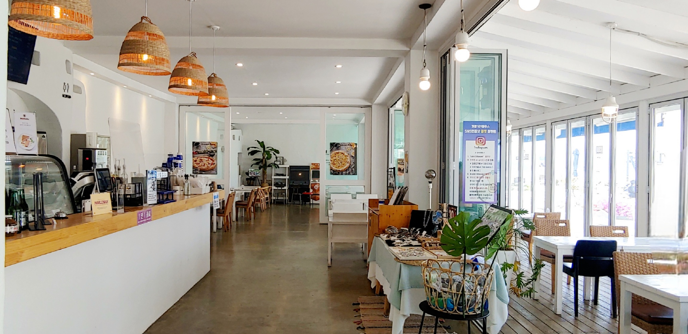 테이블은 안쪽과 발코니 쪽으로 나뉘어 있는데, 발코니 쪽에 테이블에서 바다를 보면서 커피나 피자 등을 먹을 수 있다. 다만 물때를 맞추지 못하면 뻘만 보는 경우가 생길 수 있다.