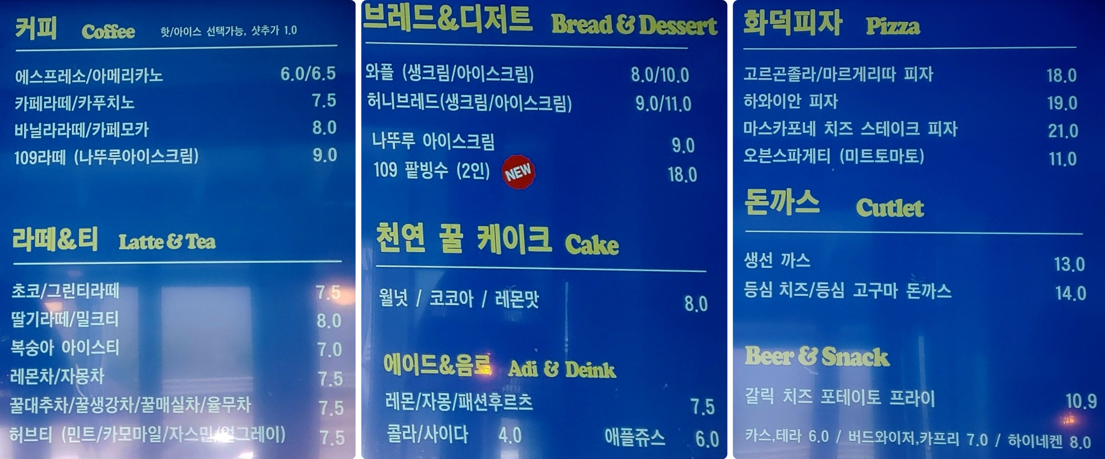 메뉴는 음료 외에 피자와 돈가스 등이 있다. 오픈 시간에는 음료만 가능하고 1시간 정도 지나면 식사 메뉴가 가능하다.