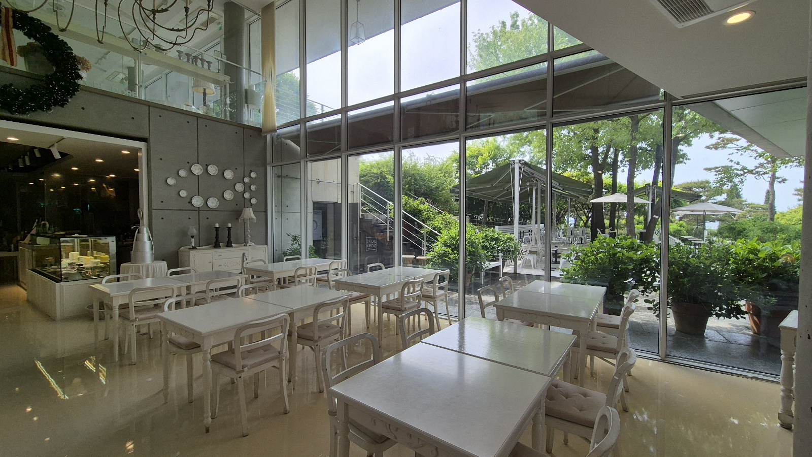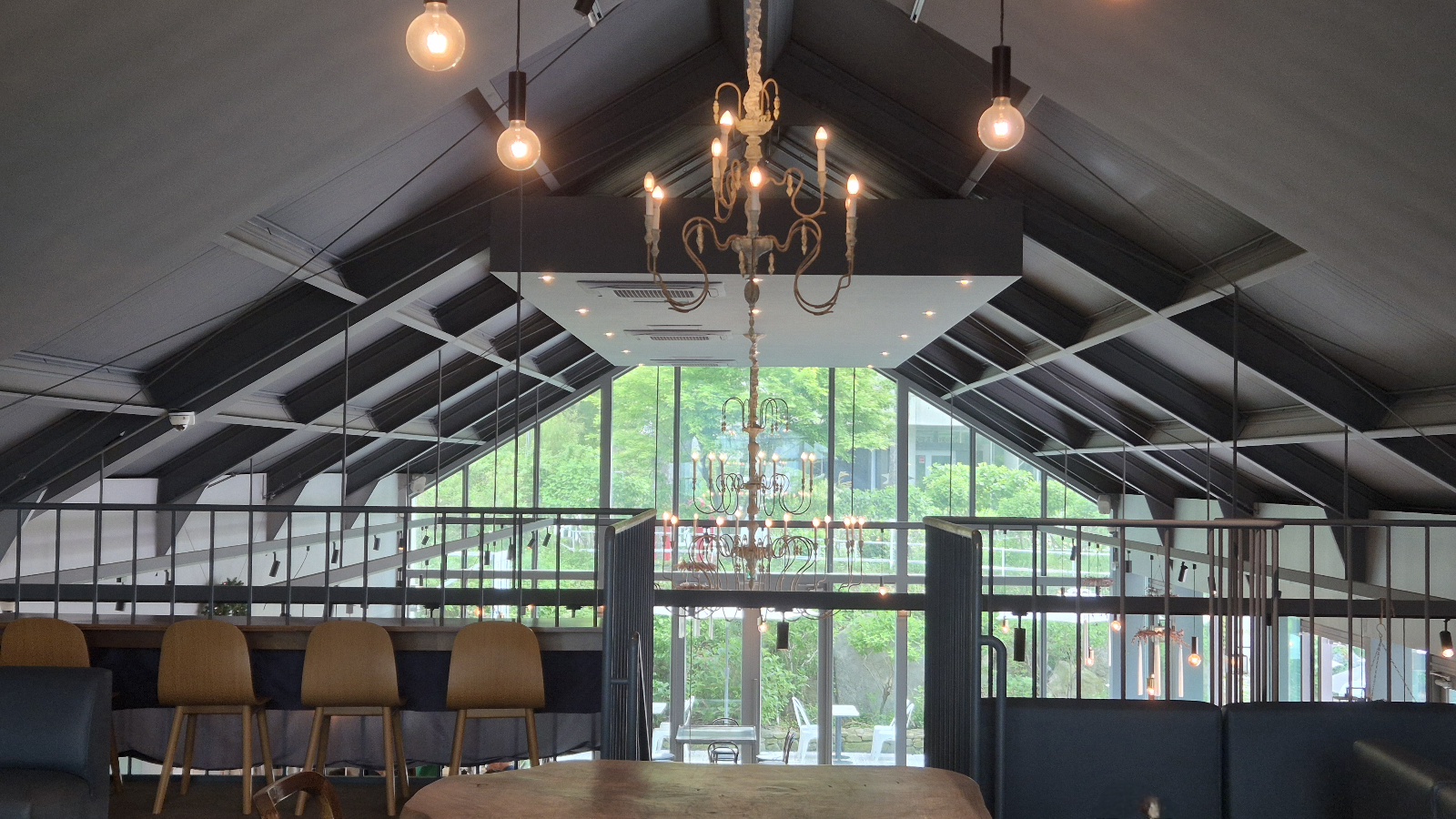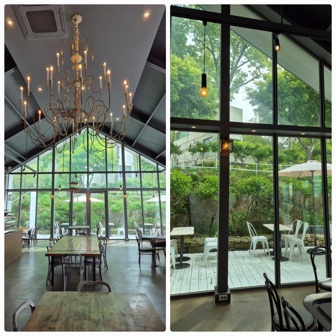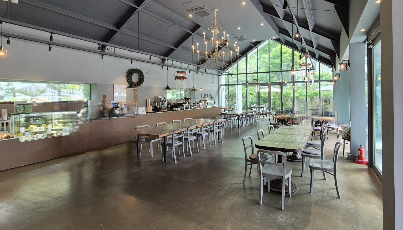 삼각형 지붕아래 넓은 공간에 여유 있게 테이블들이 놓여 있으며 통창 너머로 야외 테이블도 보인다.