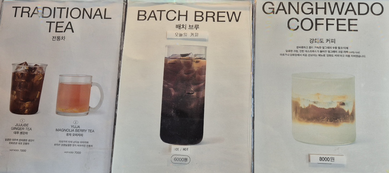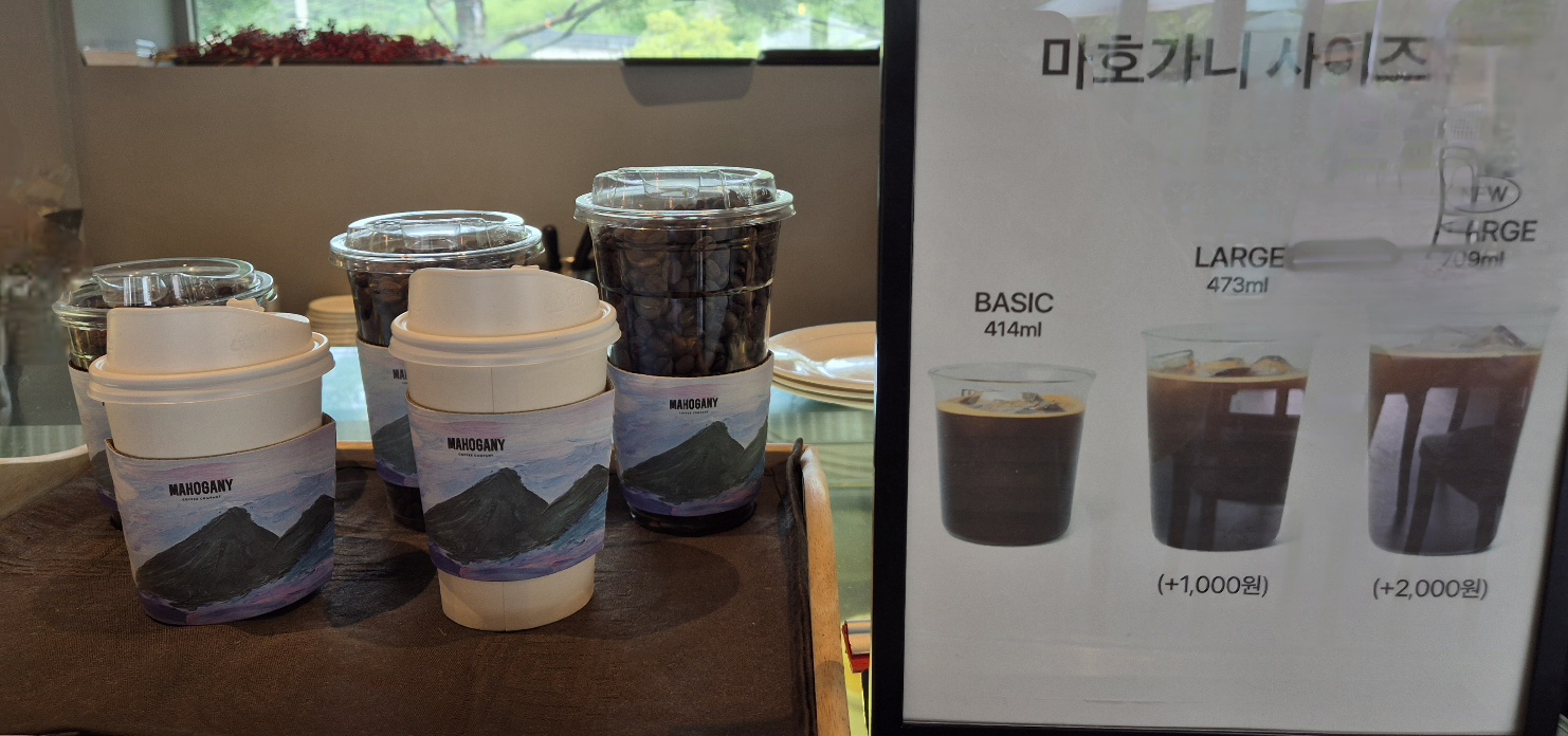 카운터 옆에는 음료 소개와 3가지 사이즈의 실물 컵이 있다.
