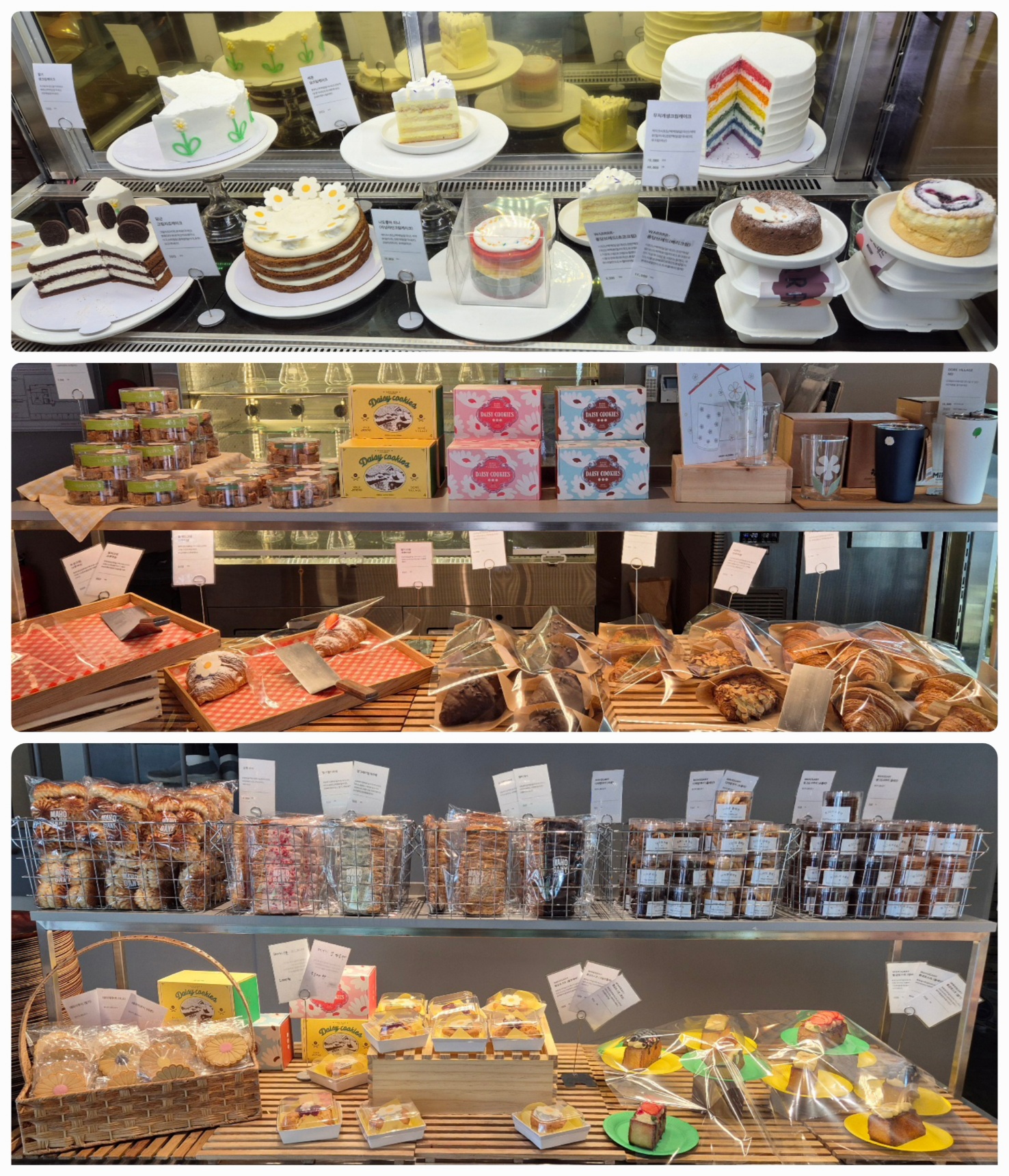 진열장과 진열대에 다양한 케이크와 빵이 놓여있다.