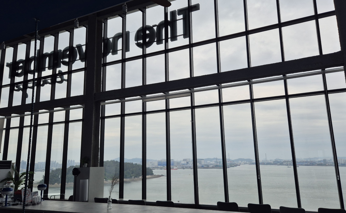 통창너머로 바다앞테라스의 루프탑과 카페들이 모여있는(바다앞테라스, 아테리토, 카페얼트 등)오션뷰 빌딩도 보인다.