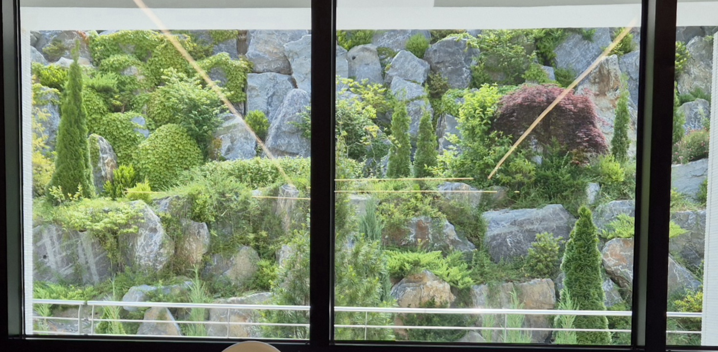 날씨가 좋을 때는 정원과 폭포 등의 경치를 즐길 수 있다.