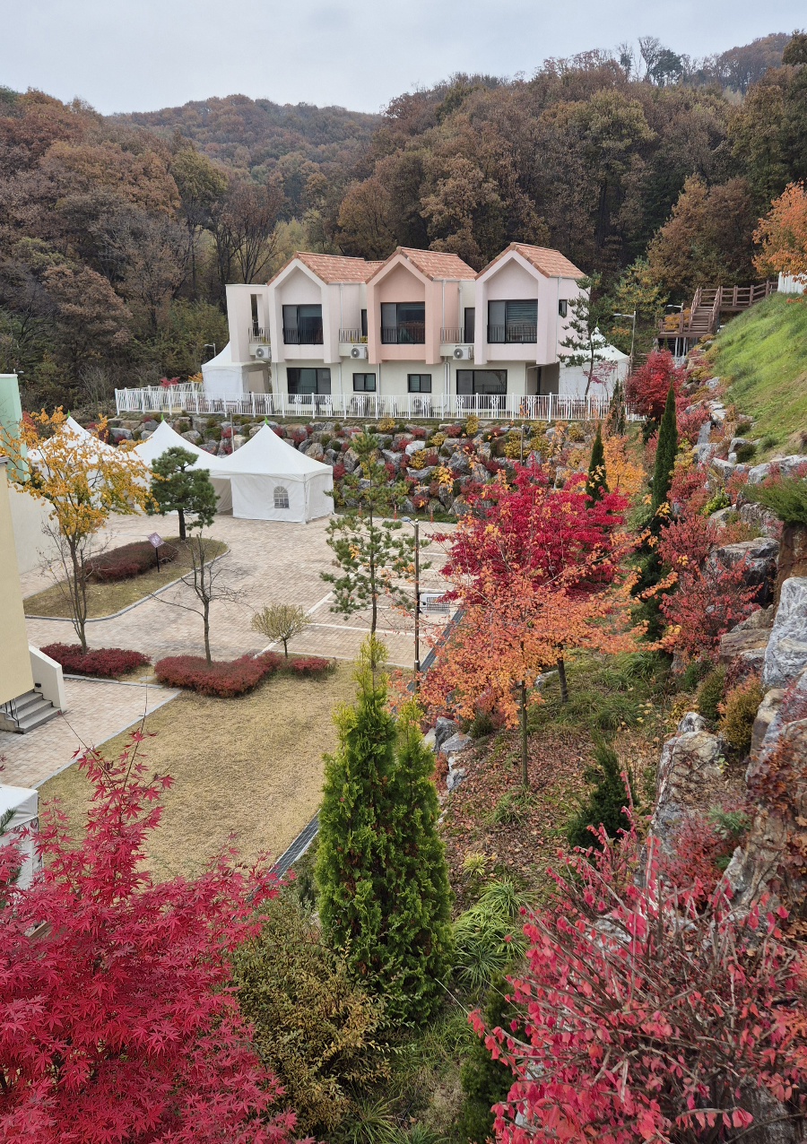 올라가는 길에 보이는 펜션 주위로 다양한 색으로 바뀐 나무들을 볼 수 있다.
