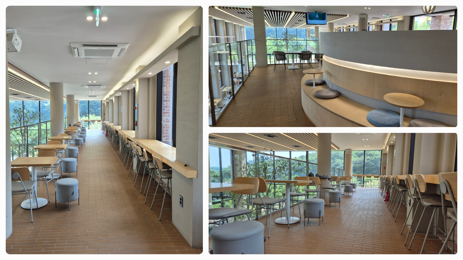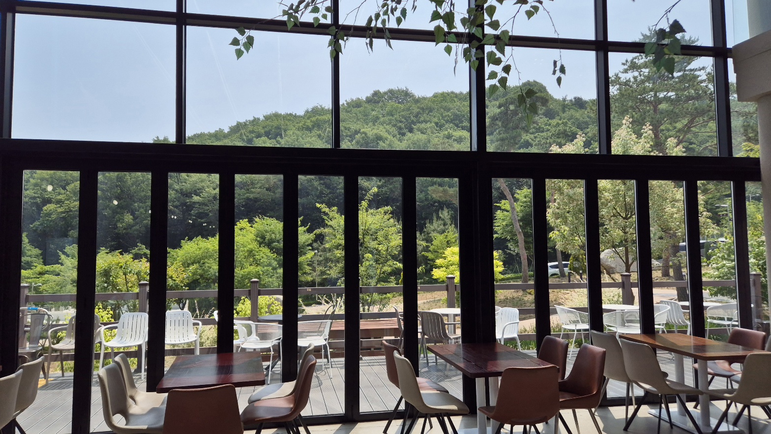 개방감이 있는 통창 앞에 테이블들이 있다.