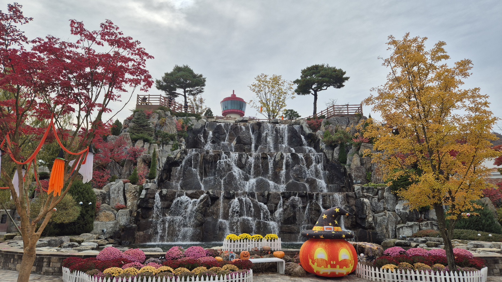 폭포 옆에는 큰 펌킨 장식이 있다.