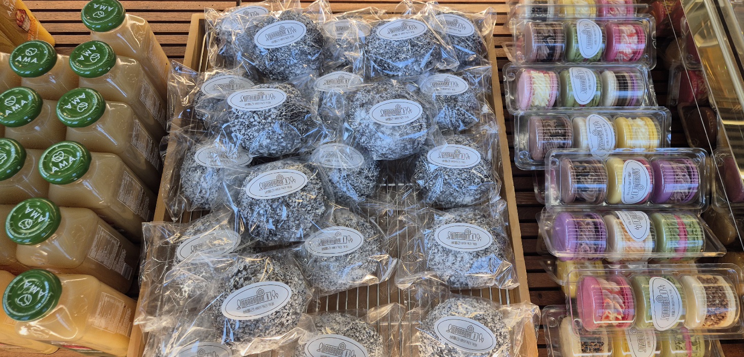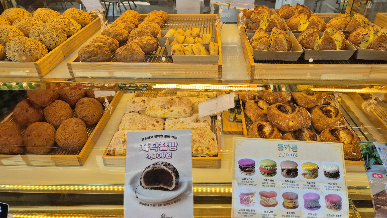 빵과 케이크 종류가 다양하며 진열장에는 유리문이 있어서 위생적으로 보인다.