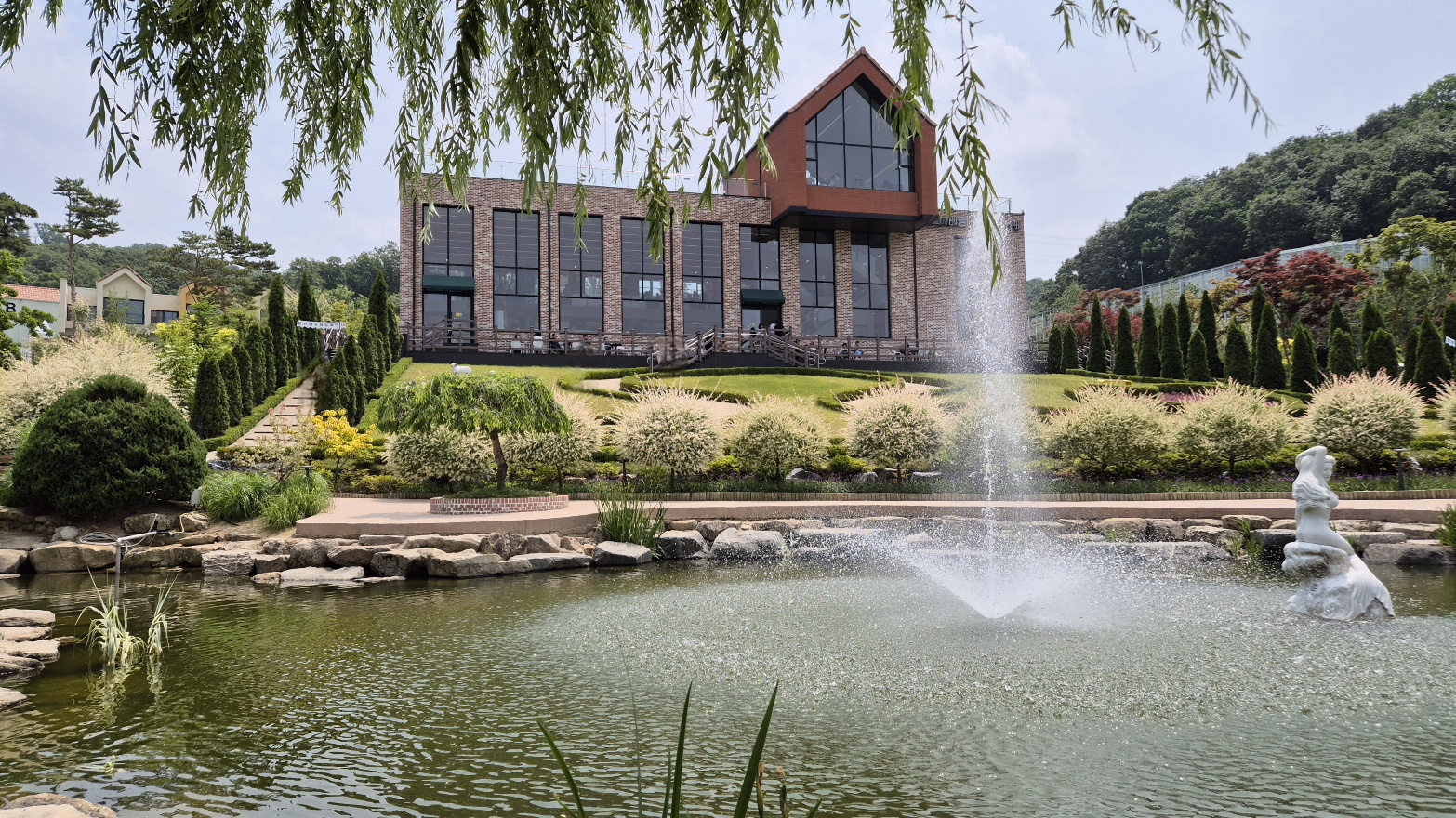 정원의 호수 반대편에서는 베툴라 카페 건물의 전경이 보인다.