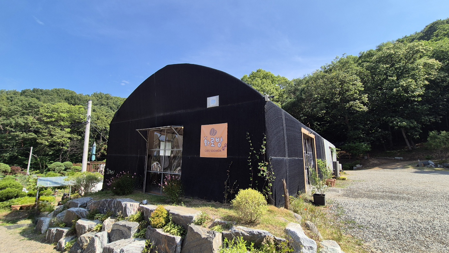 카페 건물 평에 보이는 검은색 하우스에는 화로방이라는 안내가 붙어있다.