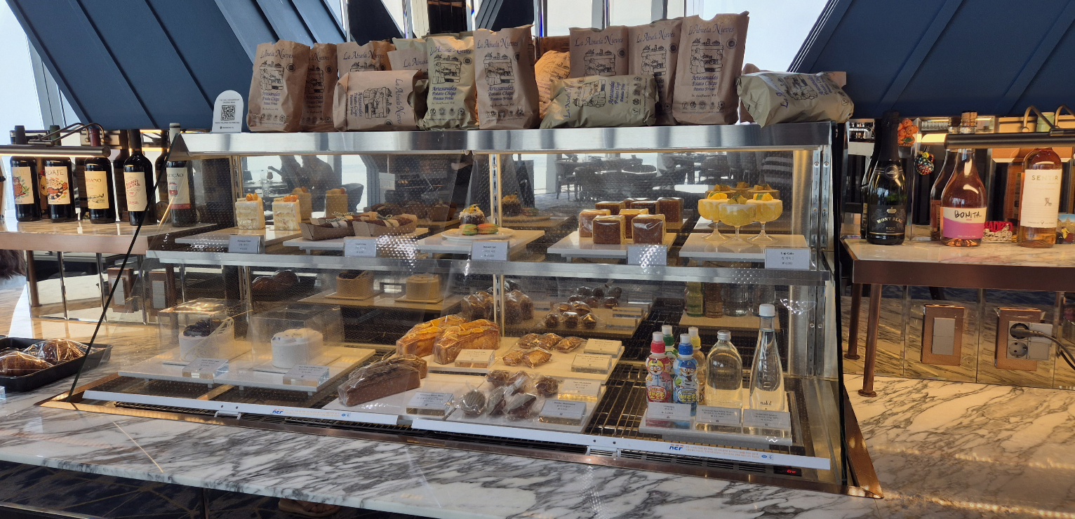 바 카운터 맞은편 창 앞에 디저트 메뉴와 케이크가 디스플레이 되어 있다.