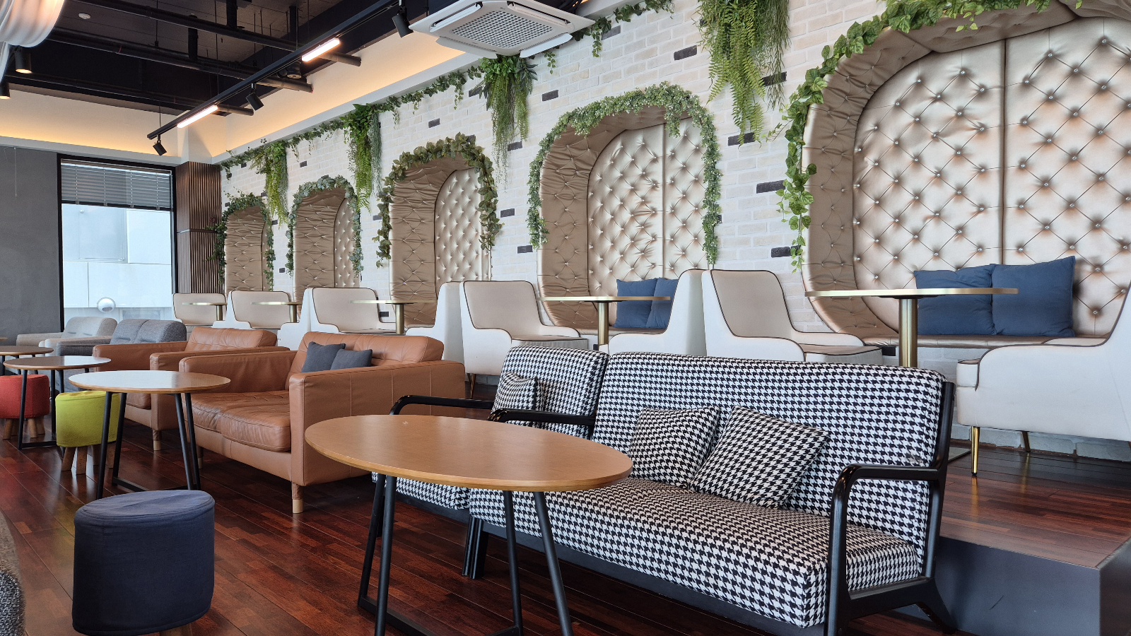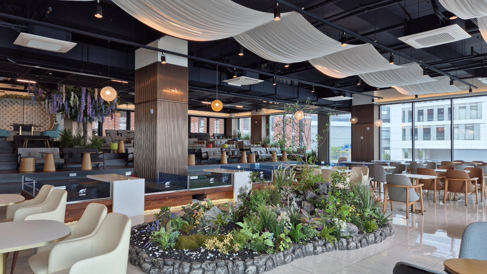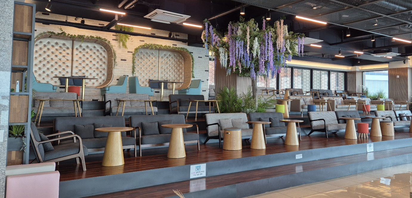 카운터 좌우측의 넓은 카페 공간은 다양한 좌석을 가지고 있다.