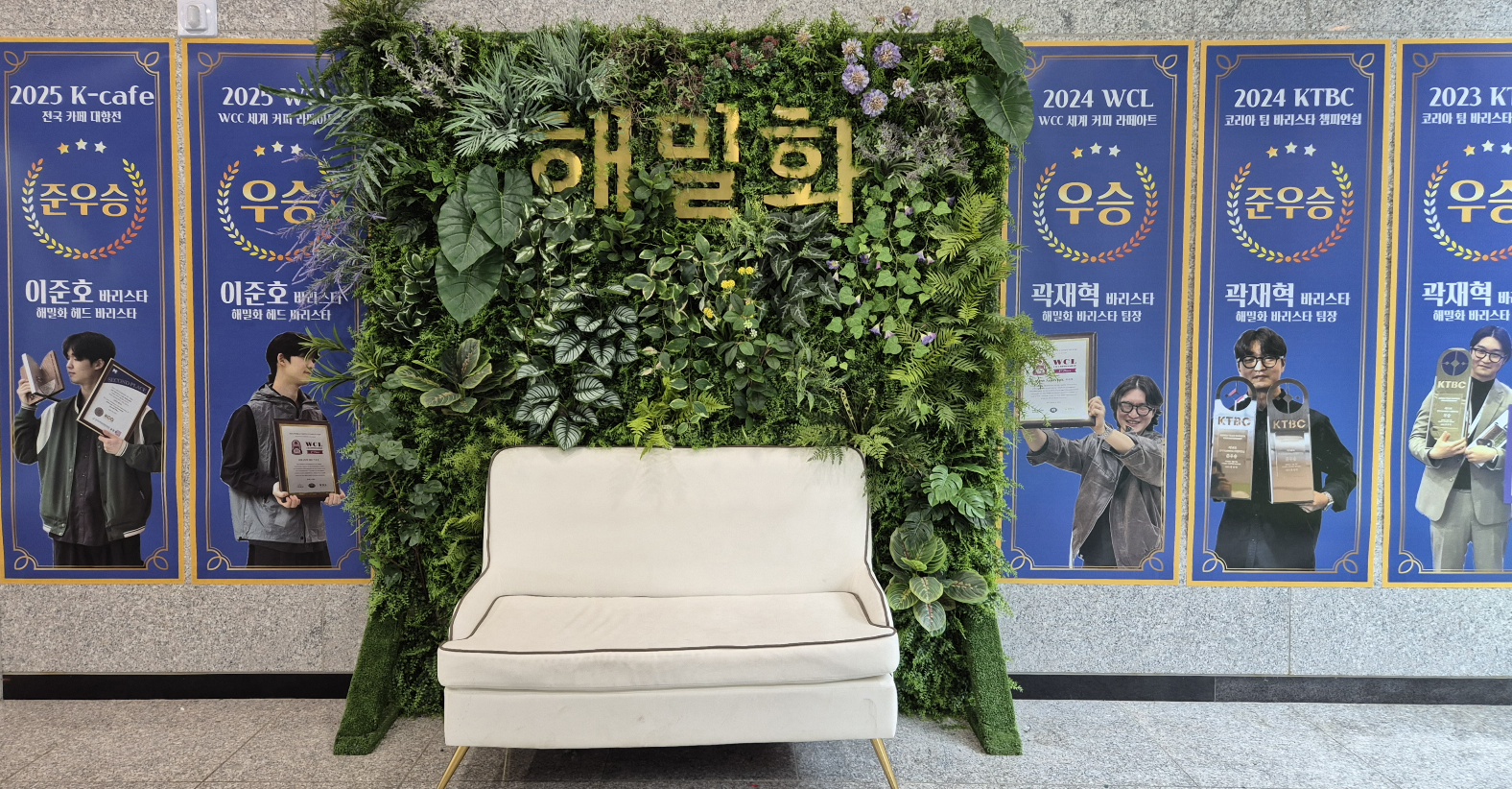 엘리베이터를 타고 2층에 내리면 작은 포토존 양 옆으로 바리스타 대회 우승 배너가 여러 개 서있다.